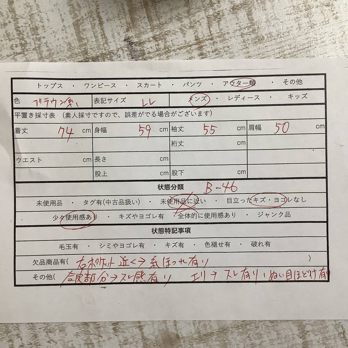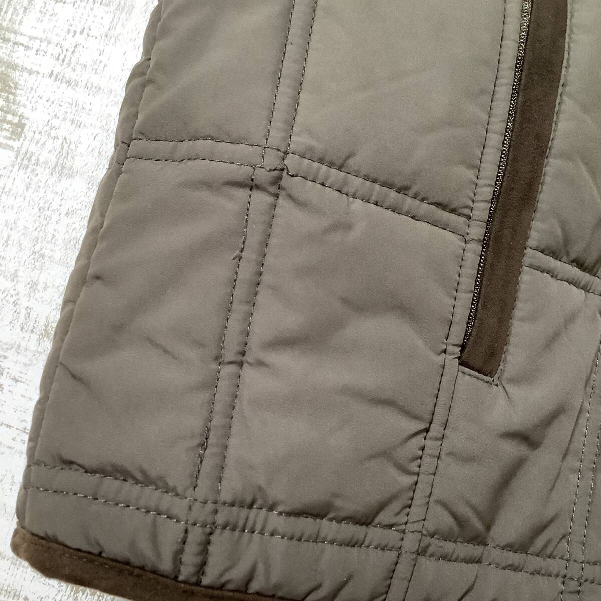 襟や合皮部分にスレ感ございます。左襟の縫い目が解けております。右ポケット近くの糸がほつれております。