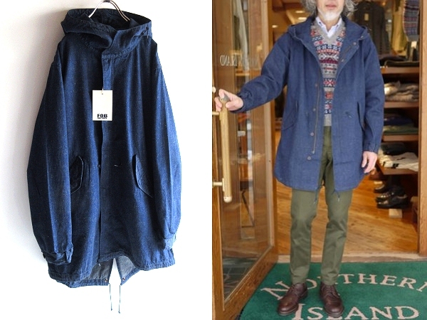 FOBファクトリーのモッズコート。染色技術の乏しかった時代のインディゴブルーを再現したネップデニムを採用しております。フロントはダブルジップ。ビンテージのM-51をベースにしたデザインです。上質な素材使いと綺麗なシルエットで、様々なコーディネートにお使い頂ける一着です。