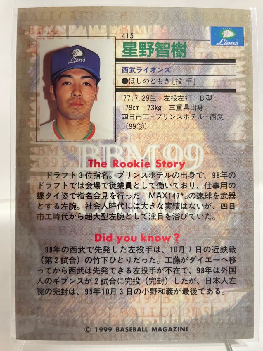 星野智樹 413 ルーキーカード BBM 1999 ベースボールマガジン 西武ライオンズ RC