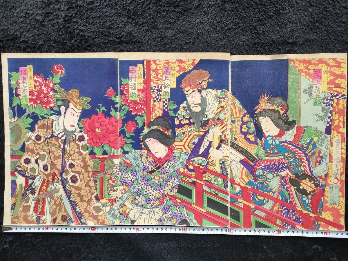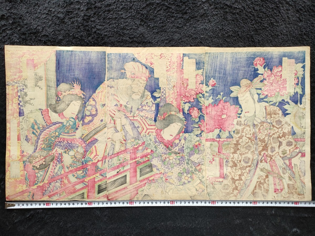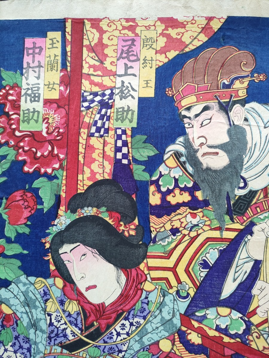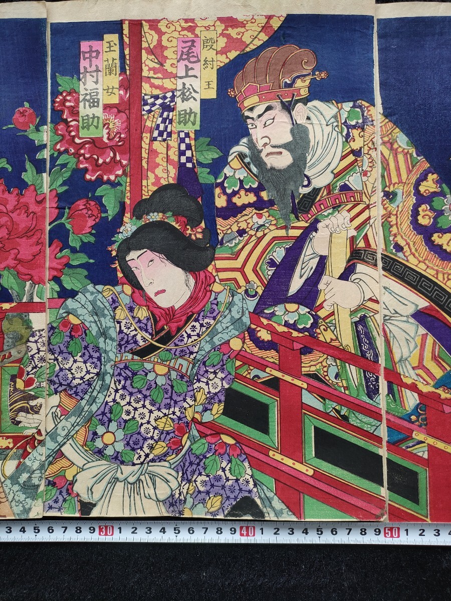 【真作】本物浮世絵木版画 豊原国周【紂王 妲己】明治期 役者絵 三枚続 大判 錦絵 保存良い