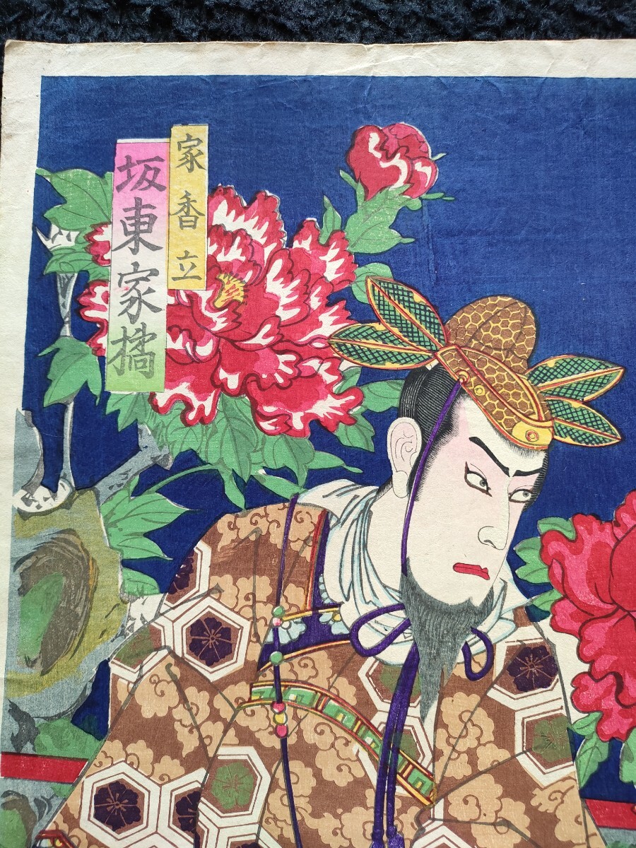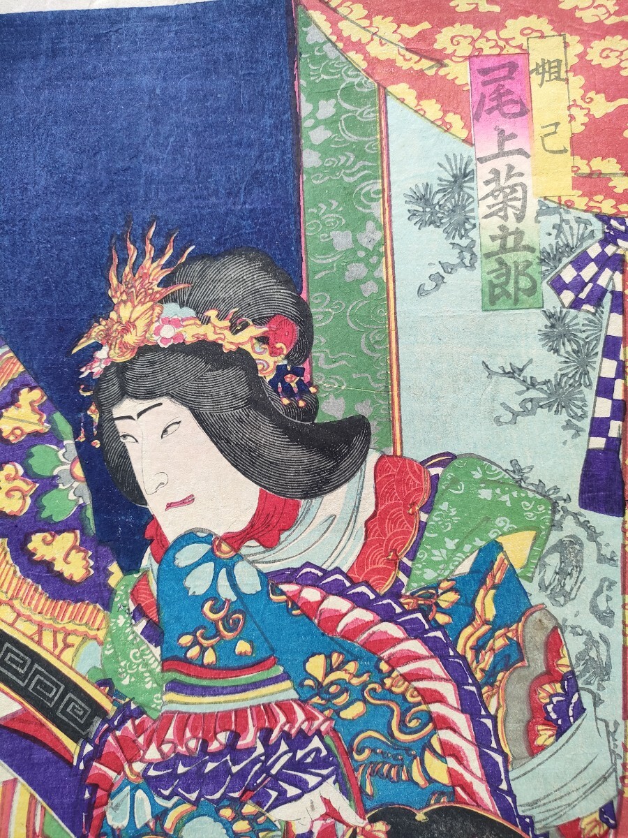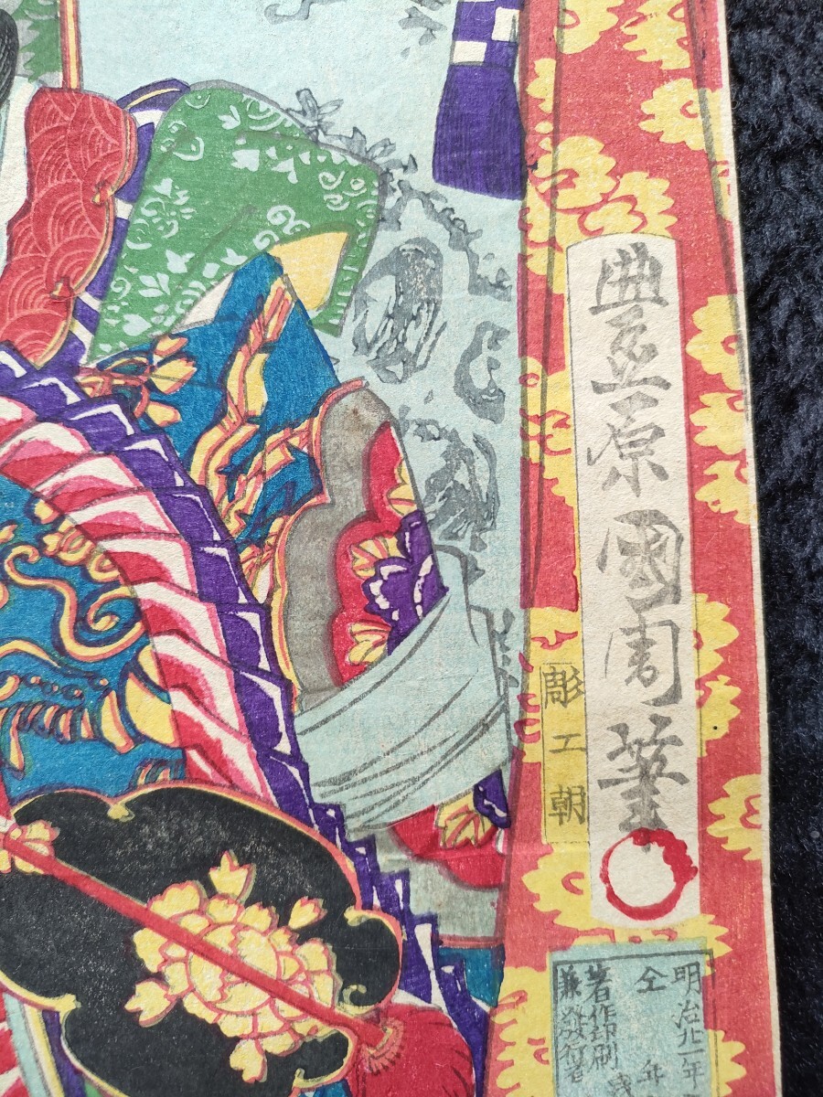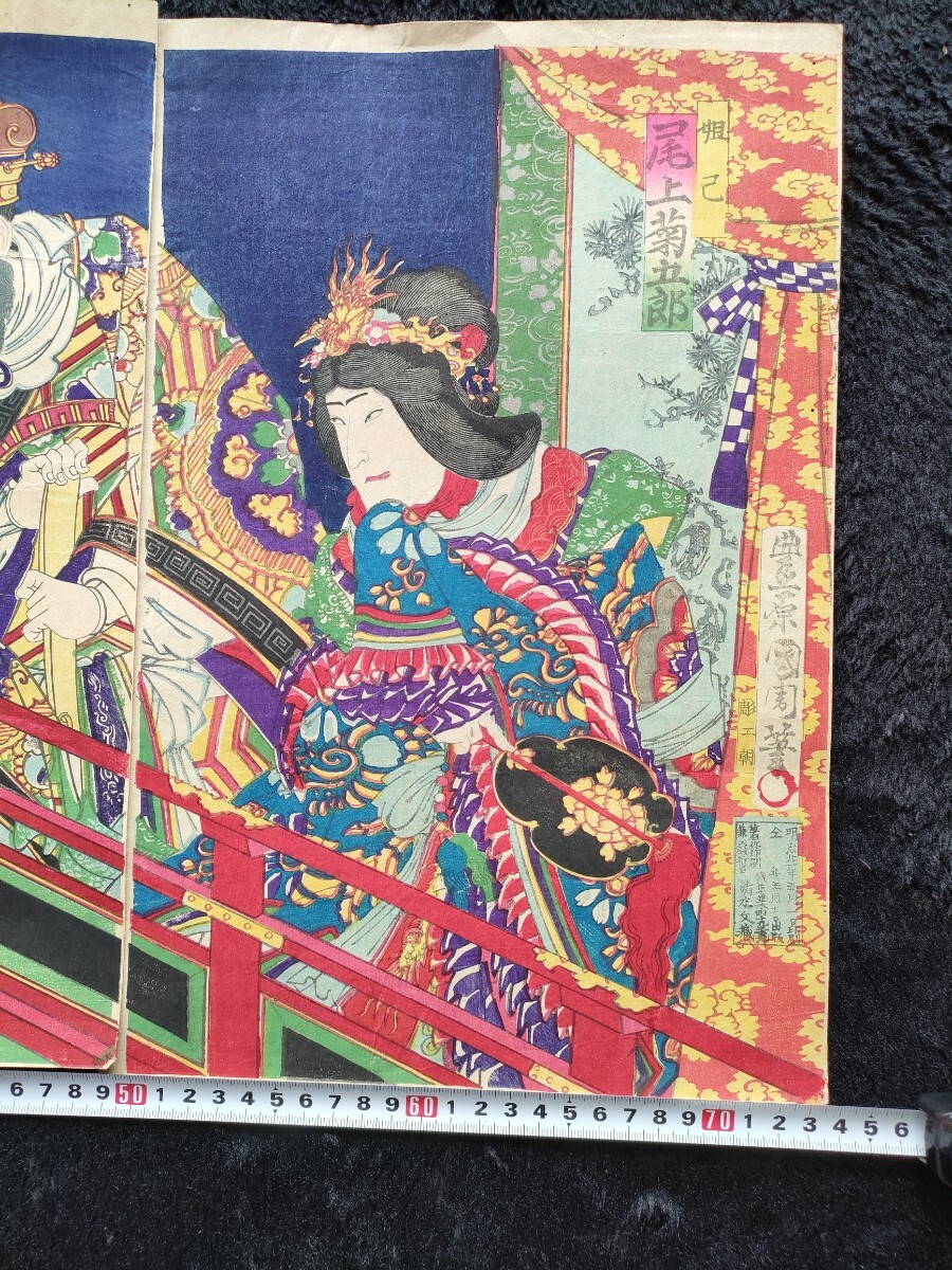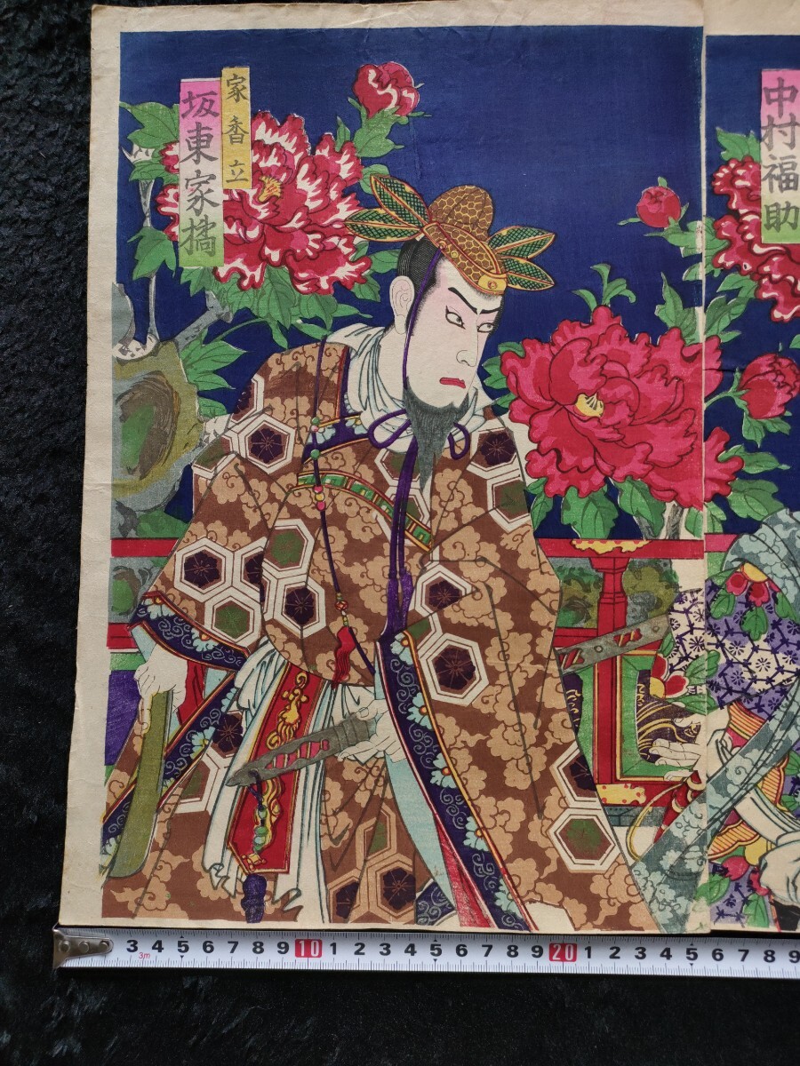 【真作】本物浮世絵木版画 豊原国周【紂王 妲己】明治期 役者絵 三枚続 大判 錦絵 保存良い
