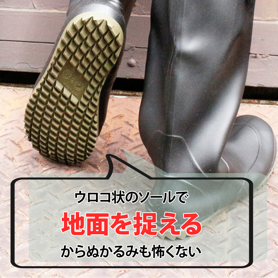 ・ウロコ状のソールで地面を捉えるからぬかるみも怖くない。