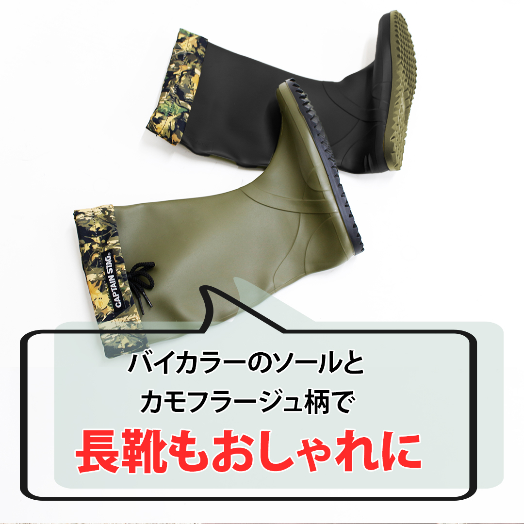 ・バイカラーのソールとカモフラージュ柄で長靴もおしゃれに。