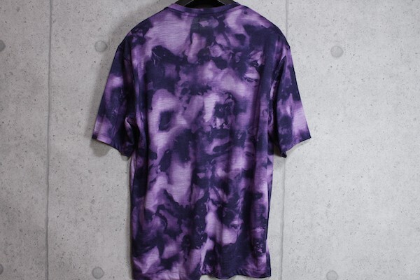 《デザイン》 まるで水墨画の様な、ムラ染め風プリントTシャツです。 前身を小さく、後ろ身の幅を出すことで、布帛物(シャツ)の様な感覚の 構造に近づけております。 袖山中心を少し後ろにずらし縫い付けるする事で、布帛物(シャツ)の 袖に近づく様にしたデザイン、シルエットにこだわった一枚です。