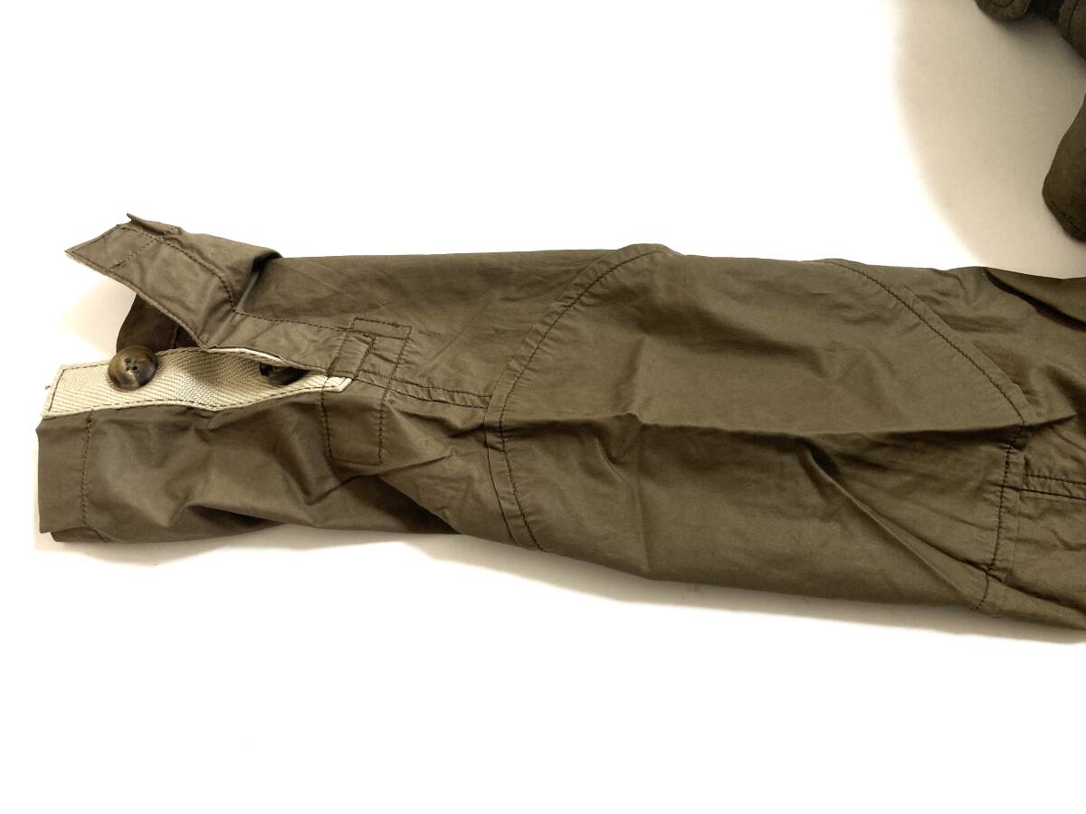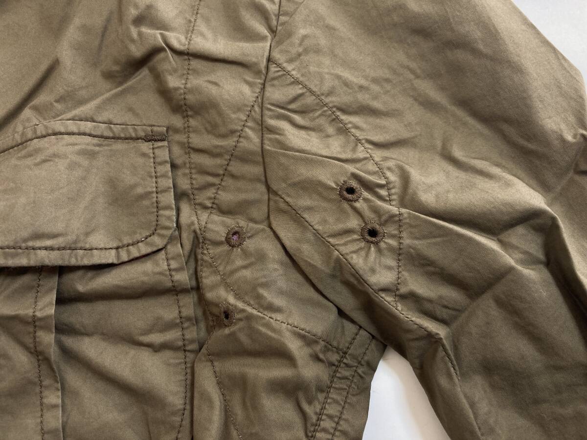 | コメント | フロントはボタン(比翼が付いていてボタンが見えないデザインになっています)、スソはラウンド、ポケットは両ムネと内側の中央の辺りに付いています。肩にはエポレット付き。ヒジ部分はエルボーパッチのようなデザインになっています。 |