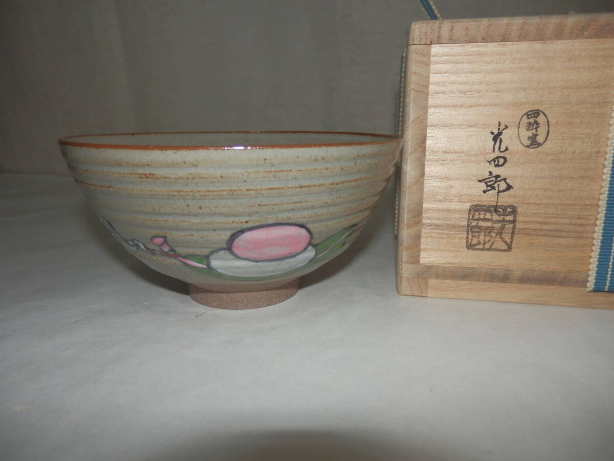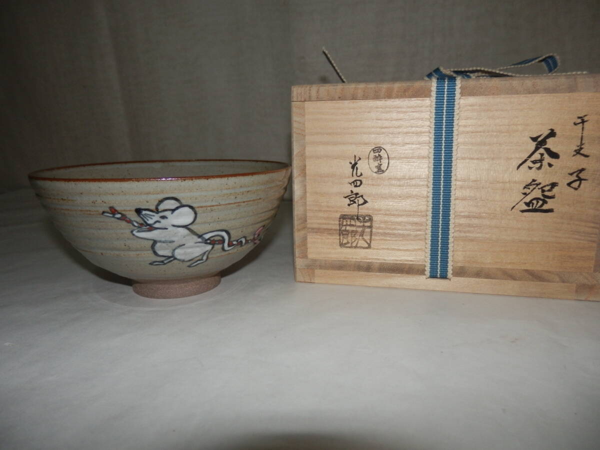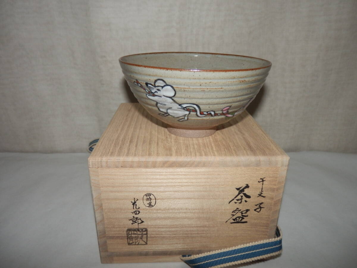 「未使用・茶道具」 奈良県の四酔窯の石崎光四郎さんの干支の茶碗です。子{ねずみ}です。 最大径約12.8cm 高さ約6.4cm 高台の横に四酔窯の印有。 桐共箱「ヤケ、シミ等有」。展示未使用品です。 どうぞ宜しく。