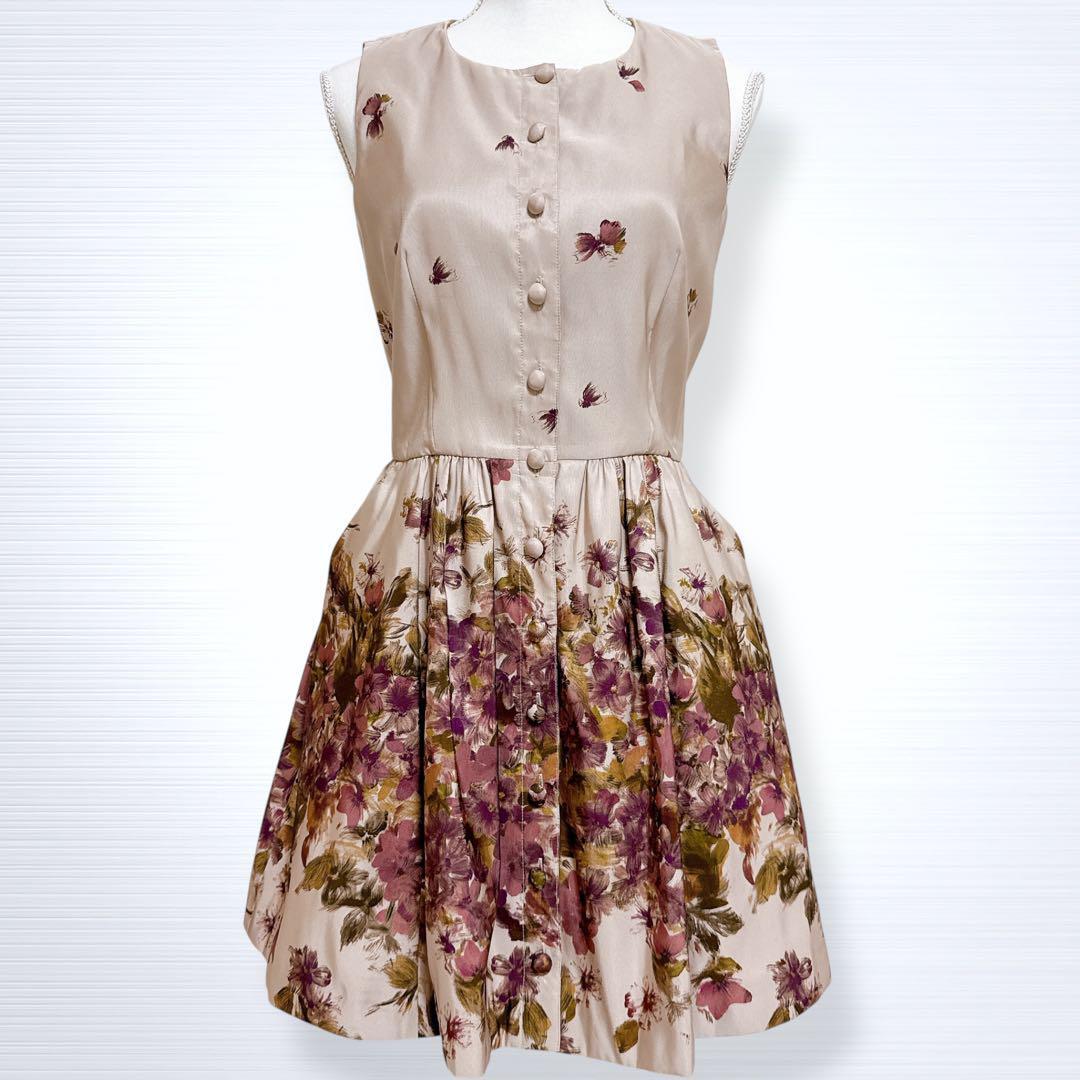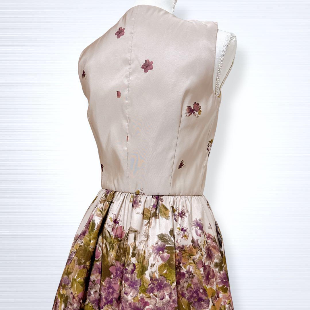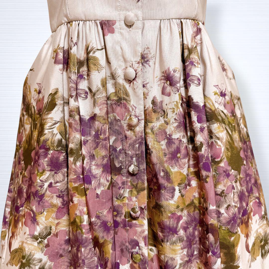 上品なベージュ味のあるシャンパンゴールドの生地に、深みのあるパープル系の花柄がプリントされた、大人可愛いフレアワンピース。