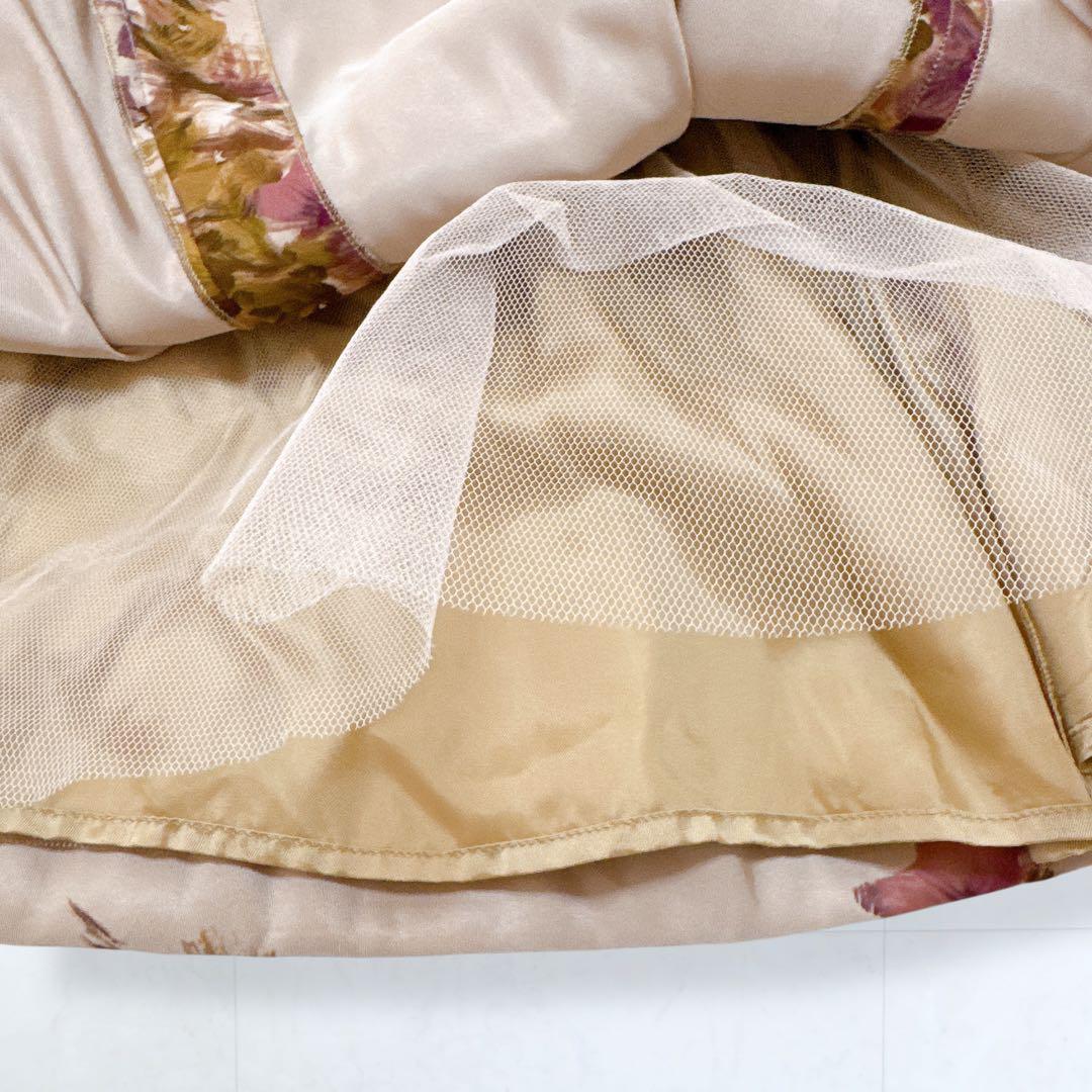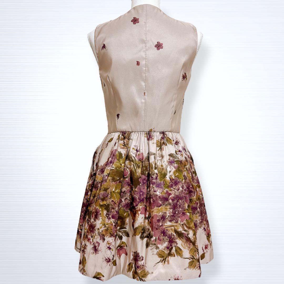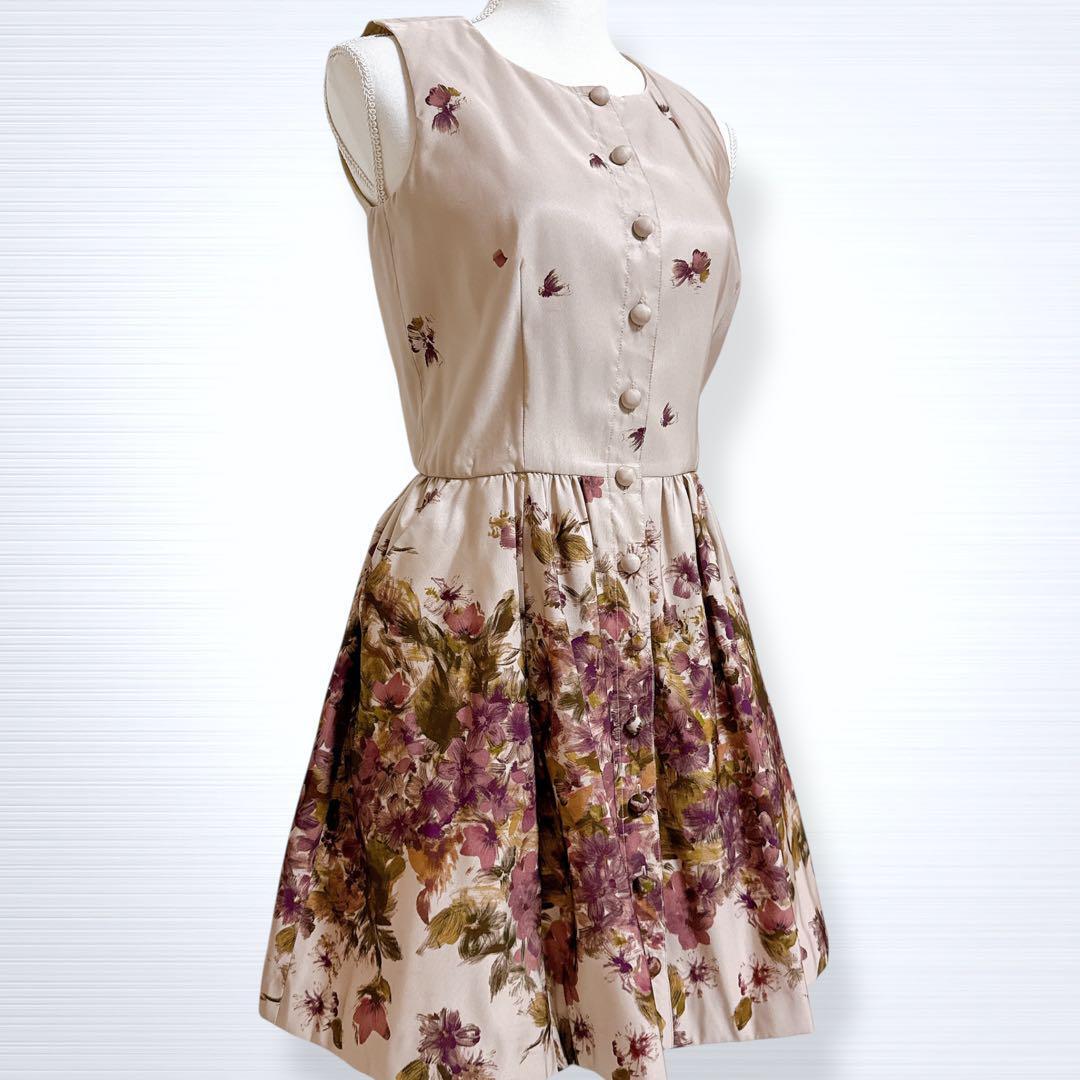 上品なベージュ味のあるシャンパンゴールドの生地に、深みのあるパープル系の花柄がプリントされた、大人可愛いフレアワンピース。