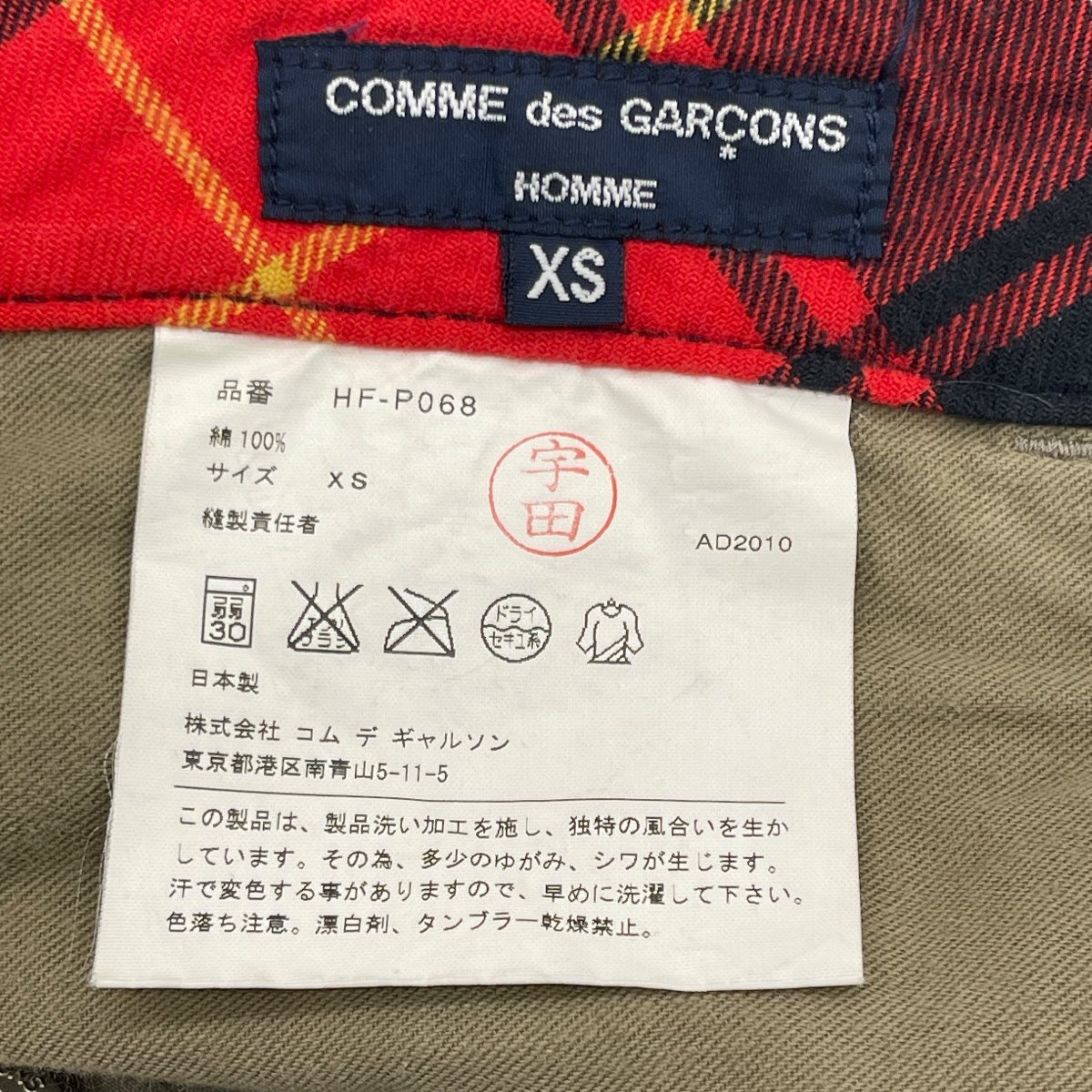 | 説 明 | AD2010年製 HFP068モデル。 内側チェックの切替がポイントで、上品かつ遊び心あるチノパン。 綿100% 柔らかな生地感とユニークなディテールが魅力的。