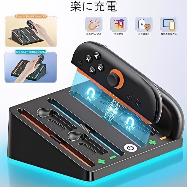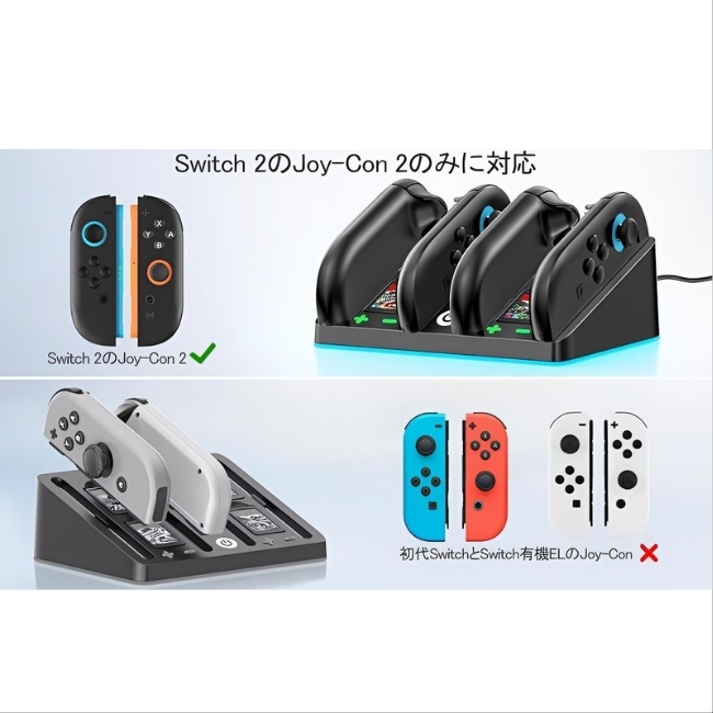 ご覧いただきありがとうございます。 商品名:Switch2 Joy-Con2 充電スタンド 【この商品が品質で選ばれる理由】 Joy-Con2専用設計と安全機能で、安心してゲームプレイを楽しめます。 ■こんな悩みありませんか? Joy-Conの充電が間に合わず、ゲームが中断してしまう。 たくさんのJoy-Conやゲームカードでデスク周りが散らかりがち。 充電状態が分かりにくく、充電されているか不安になる。 ★こんな時におすすめ! 複数のJoy-Conをまとめて充電したい時。 ゲーム環境をすっきり整理したい時。 充電状態をひと目で確認したい時。 ------------------------------------- 【対応機種と使用方法】 Joy-Con 2 充電スタンドはSwitch 2のJoy-Con 2のみに対応しています。 右ジョイコンを「+」充電スロットに、左ジョイコンを「-」充電スロットに挿入してください。 【充電機能】 Joy-Con 2を4個まで同時に充電できます。 LEDインジケーターランプにより、充電中はオレンジ色、充電完了時は緑色に点灯し、充電状態が目視でわかります。 【デザインと収納】 9つのモードを選択できるRGBライトを搭載し、お部屋のゲーミング雰囲気を向上します。 4台のJoy-Con 2を充電するだけでなく、収納もできます。 よく遊ぶ4枚のSwitchゲームカードも収納可能です。 少し傾斜をつけられるデザインで扱いやすいです。 【安全機能】 過充電防止機能を備えています。 ご不明な点などございましたら お気軽に「質問する」からお問い合わせください。 |