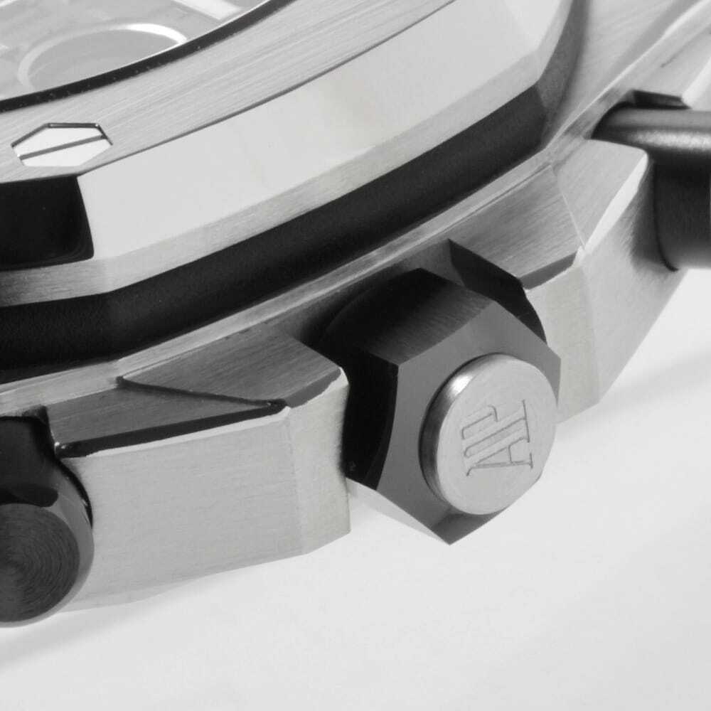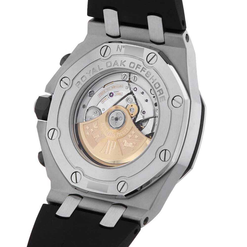 | モデル情報 | オーデマピゲ2014年発表モデルのひとつである"ロイヤルオーク オフショア クロノグラフ"。こちらはシースルーバックになり、リューズとプッシュボタンがブラックセラミック製に変更されたモデルです。ムーブメントには自動巻きCal.3126/3840を搭載。100m防水。 |