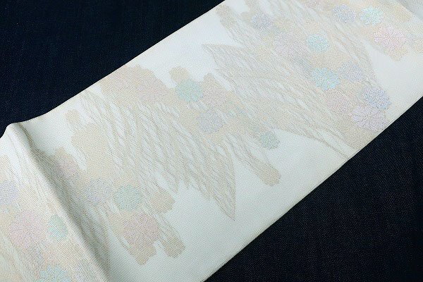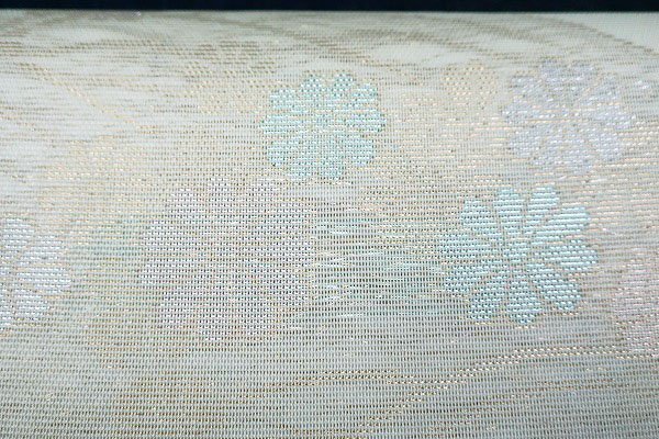 薄い山葵色の絽織地に波に菊があしらわれた袋帯です。 箔糸が上品に煌めく一本です。 担当:前田 |
