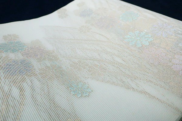 | 袋帯 夏帯 夏 絽 薄い山葵色 菊 箔糸 長さ4m30㎝ お洒落 正絹 フォーマル 仕立て上がり 着物フィ m-7886 |