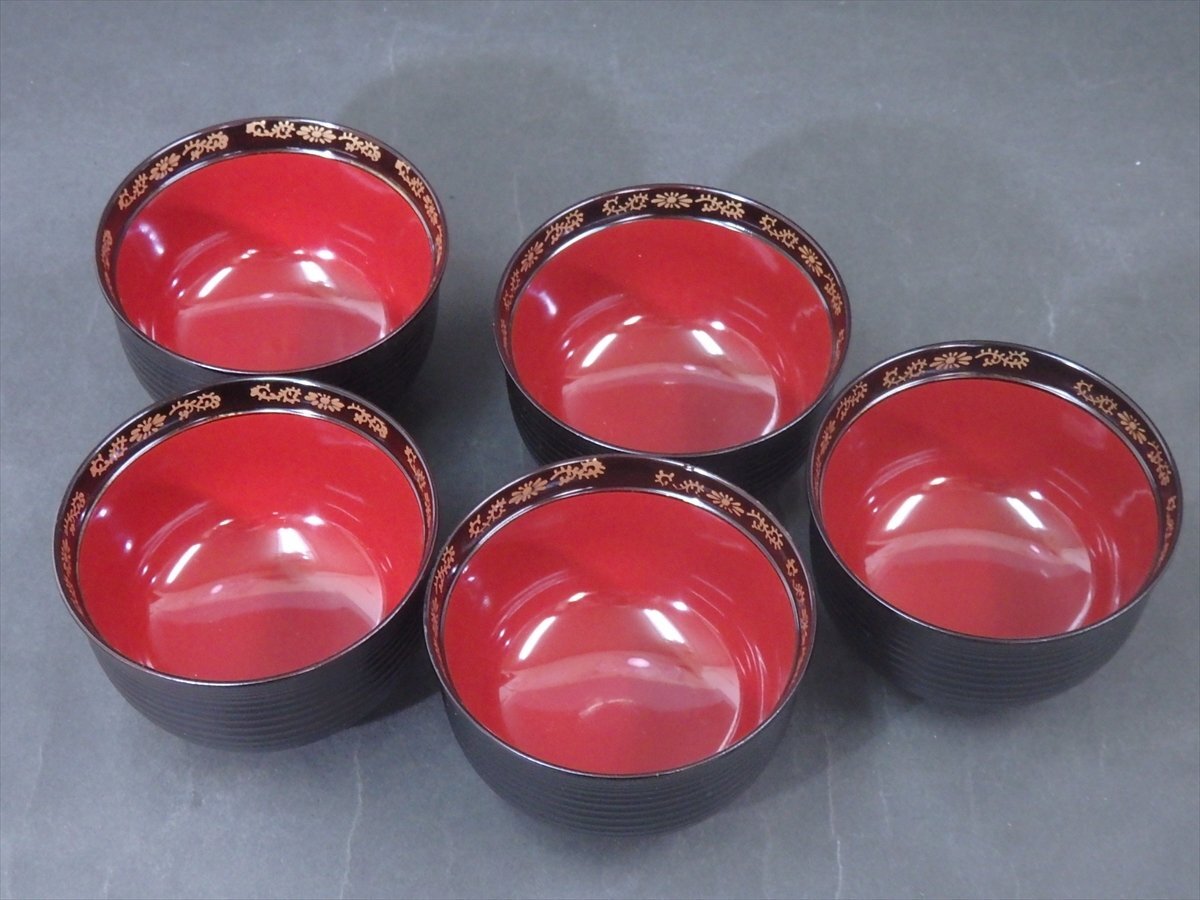 ★未使用【汁椀5客】吸物椀 天然木加工品・うるし塗り 直径11×高さ6.8cm おみそ汁に! 和食器 店舗用品