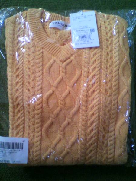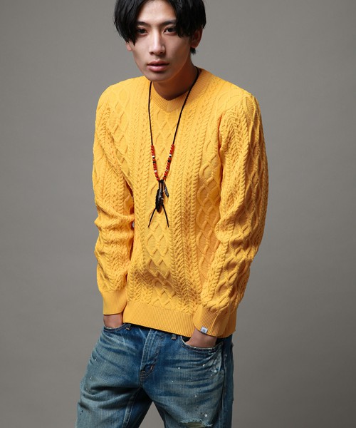 VANQUISH アラン編み 浅Vネックセーター ニット L 黄