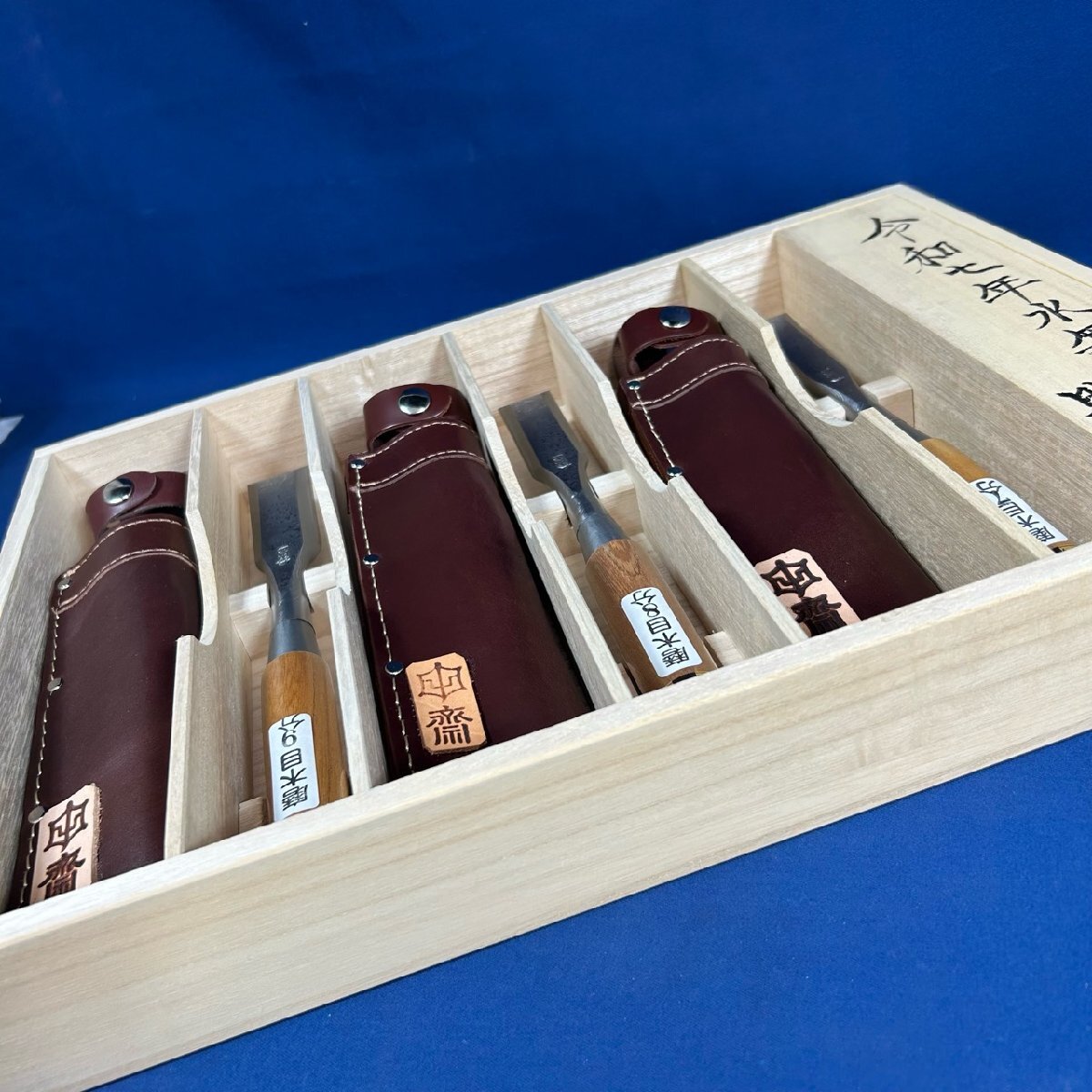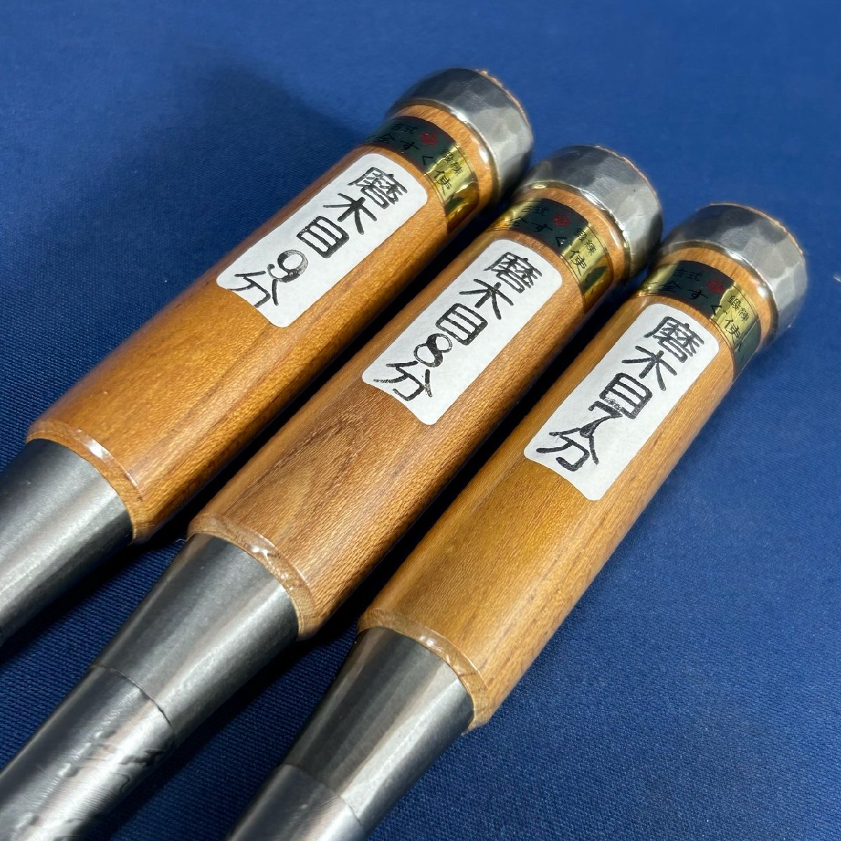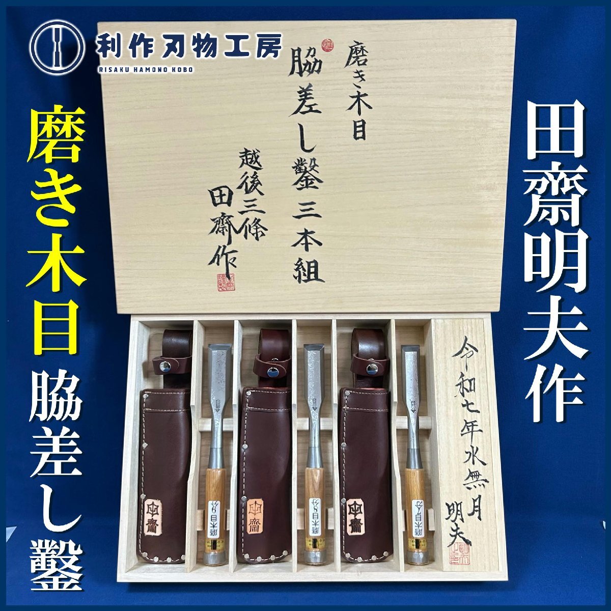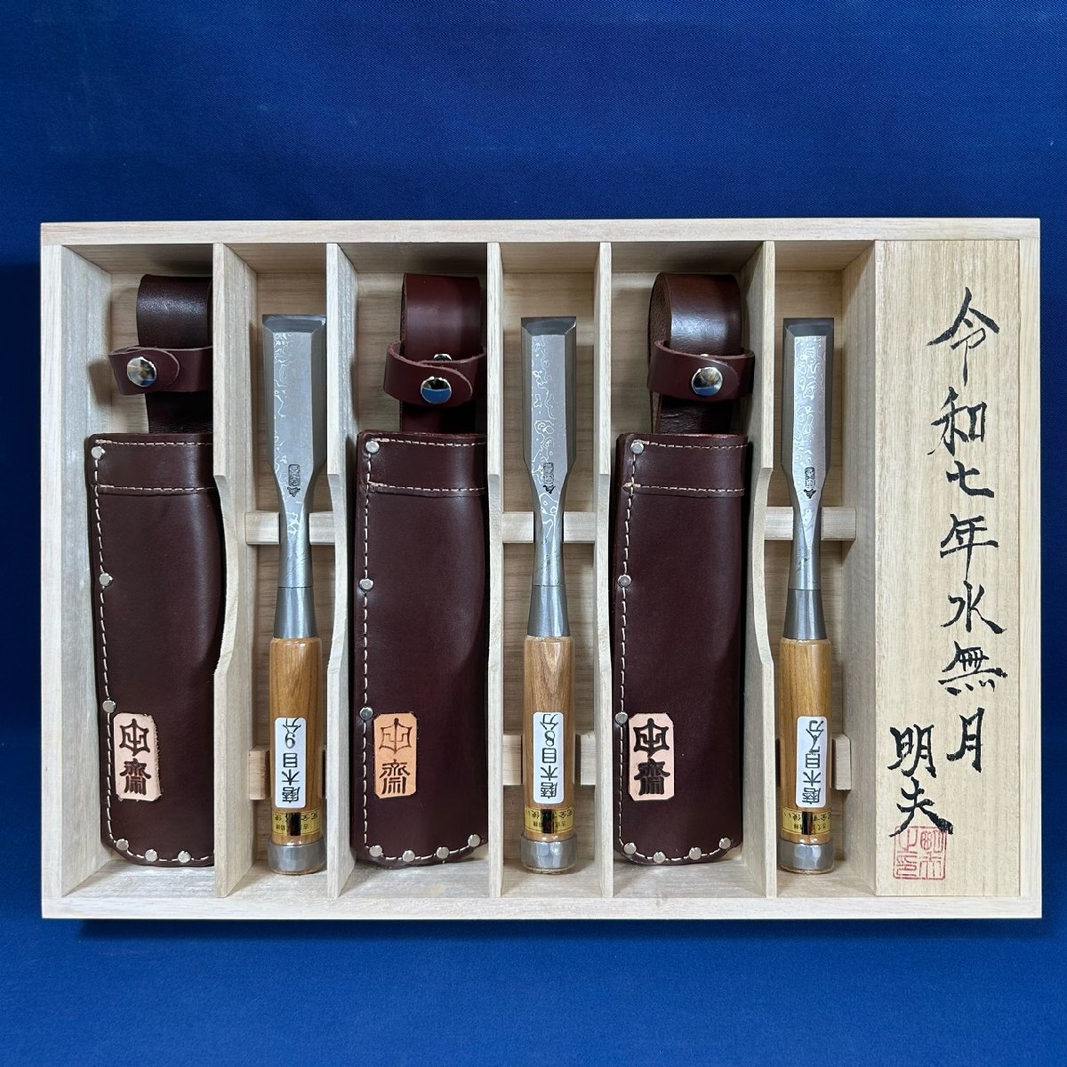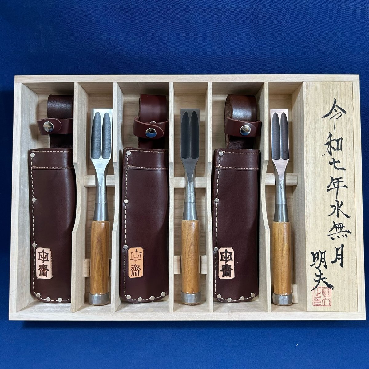 【刃物市11/18まで】《利作特注品》田齋明夫作 磨き木目 脇差し鑿 3本組(7分/8分/9分) 欅柄『脇差し用特注かぶせ桐箱 製作/令和七年水無月