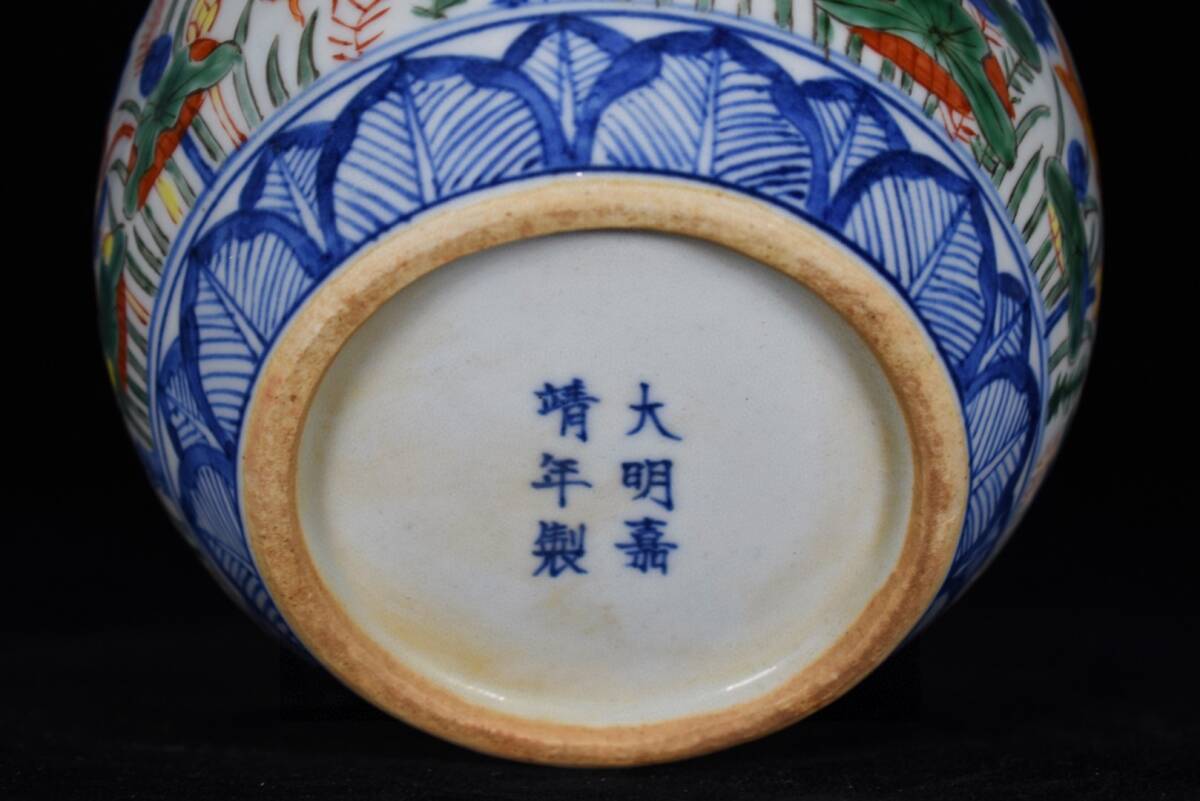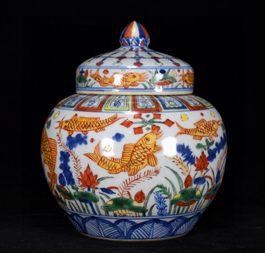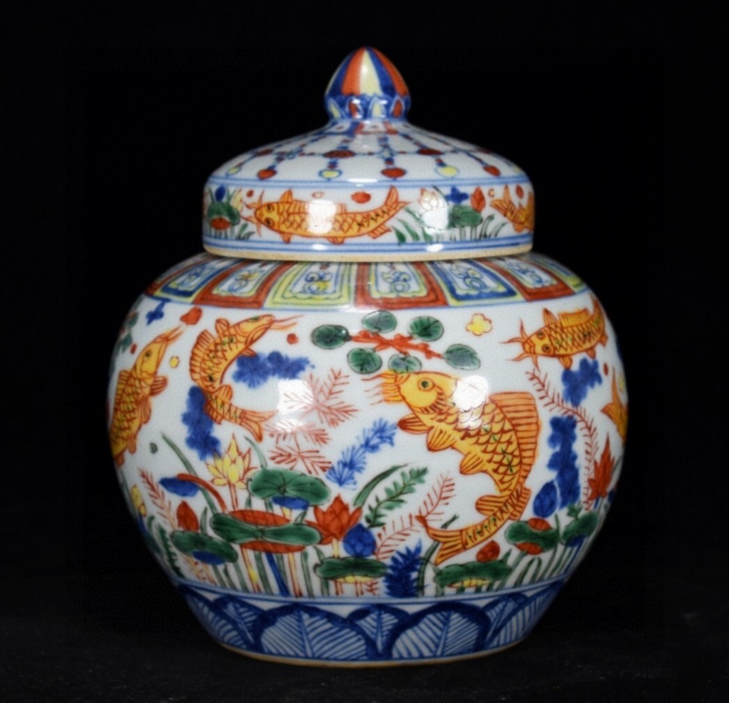 *珍品旧蔵* 大明 嘉靖年製 五彩魚藻紋 蓋缶一対 陶芸 古陶磁器 中国磁器 極細工 唐物 中国古玩 骨董品 古美味 H46