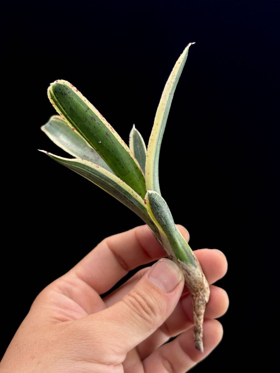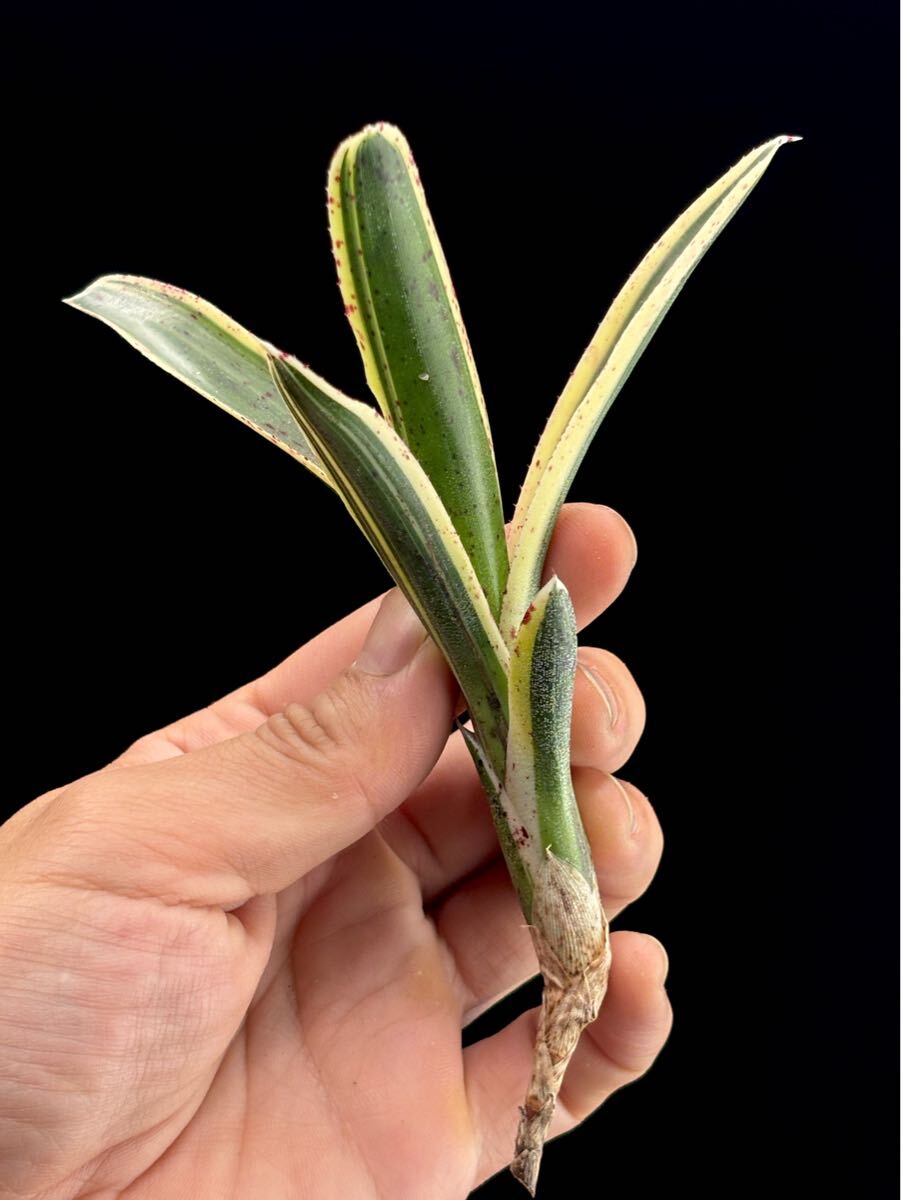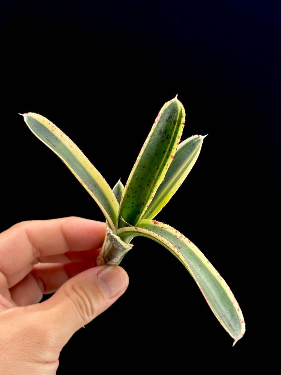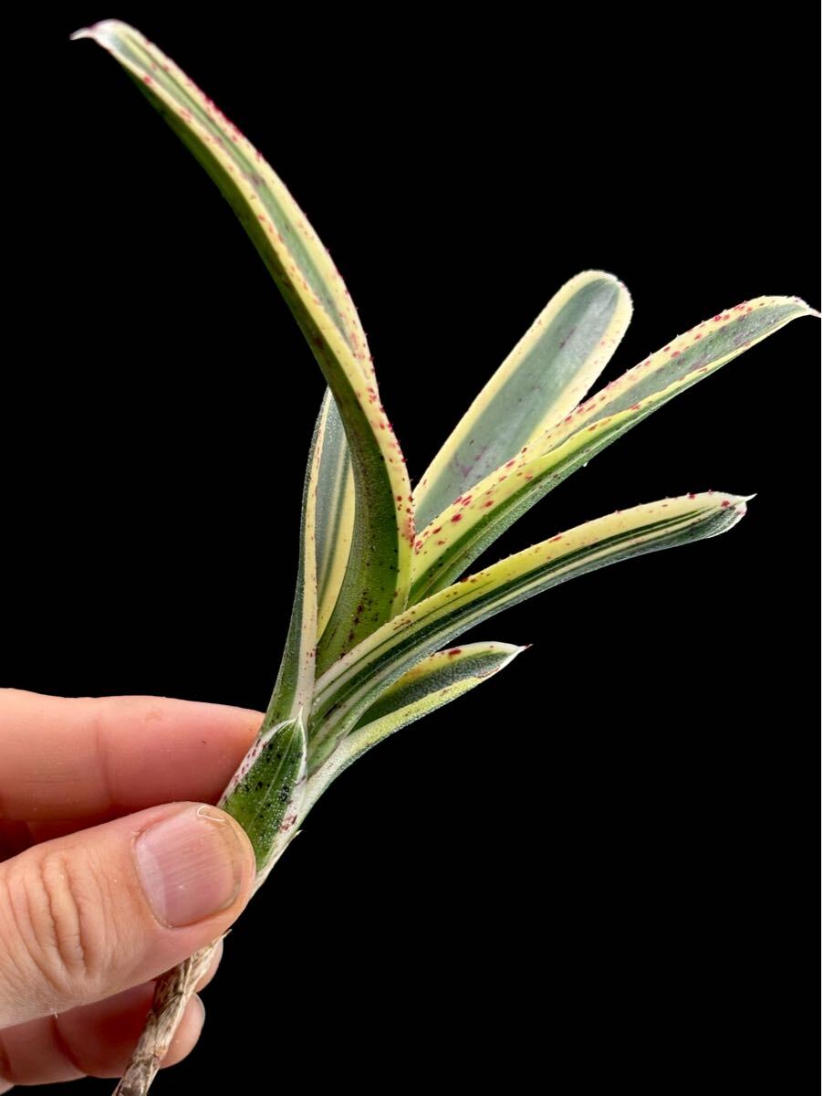 Bromeliad Cultivar Register #12841 に登録のある Neoregelia 'Bodacious' と本品が同じものかどうかは当方にはわかりませんが超小型の白抜け斑、赤いスポット、N. lilliputiana の肉厚な質感を待つ魅力の多いネオレゲリア。