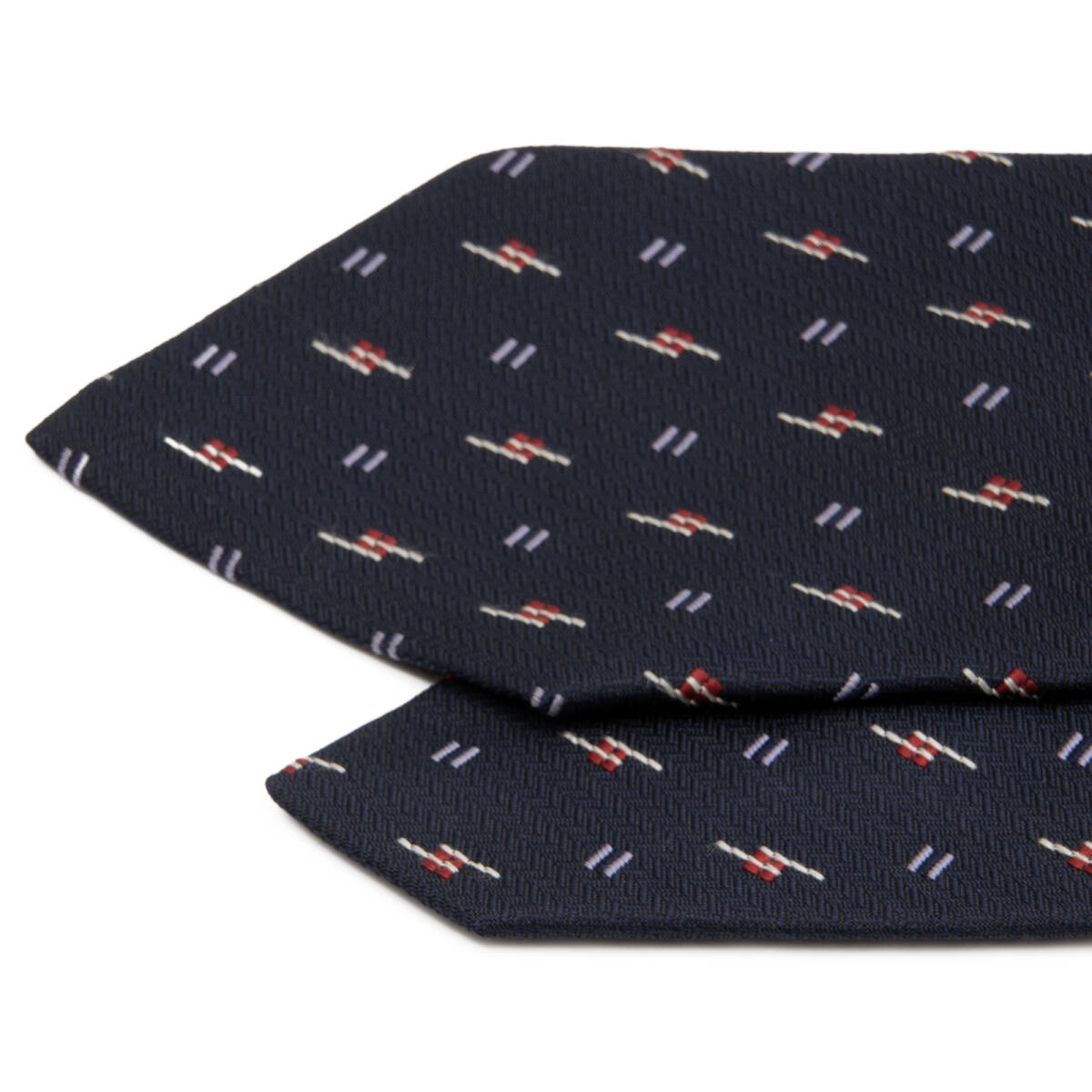 深いネイビーブルーの地に、稲妻を思わせる、赤と白のシャープな模様がリズミカルに配置されております。