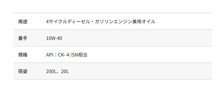 | 適合型式等 | ディーゼル微粒子捕集フィルター(DPF)・排気ガス再循環システム(EGR)・尿素SCRシステム・コモンレールシステムに対応したエンジンオイルです。 スス分散性や耐摩耗性及び酸化安定性に優れており、輸入機械や国内のCK-4指定車、EPA Tier4 規制対応機械に最適です。 ガソリンエンジンにもSN相当のオイルとしてご使用いただけます。 |
