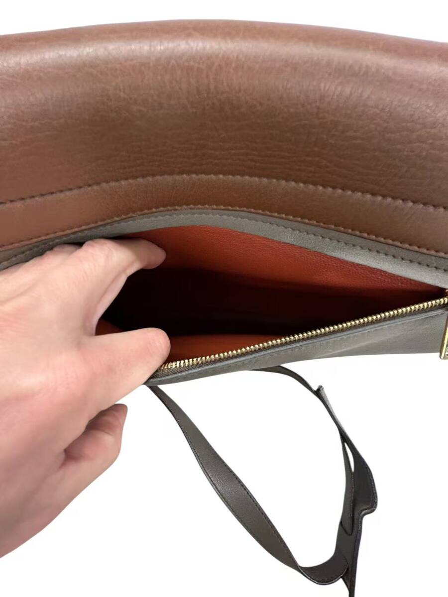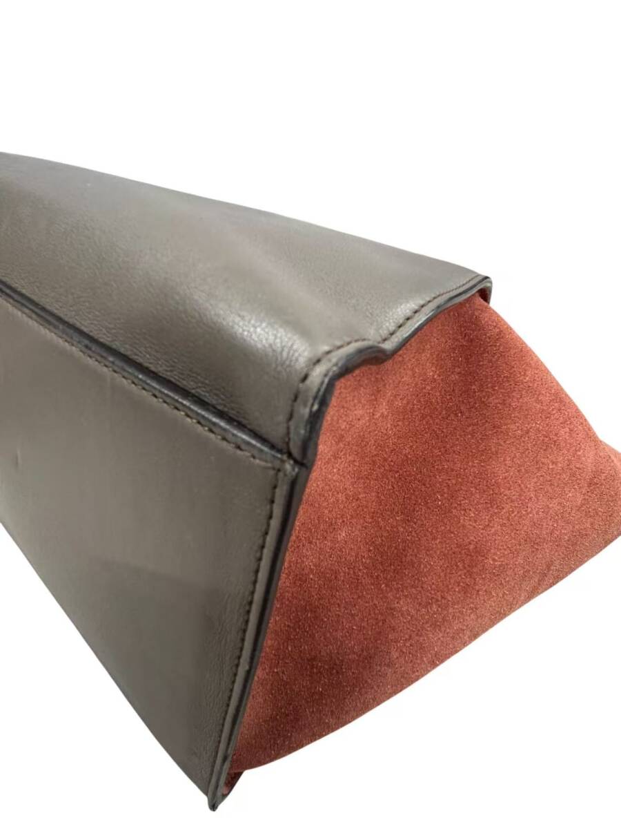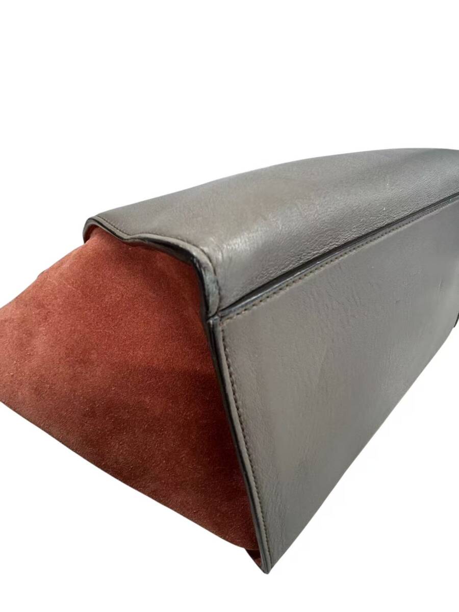 素材:カーフスキン・スエード カラー:トリコロールカラー(ブラウン系・グレー系) サイズ(平置き) 横幅・底部:29.5cm 横幅・最長:49.5cm 縦幅・高さ:24cm マチ・奥行:16cm ハンドル:36cm ショルダー:74.5cm