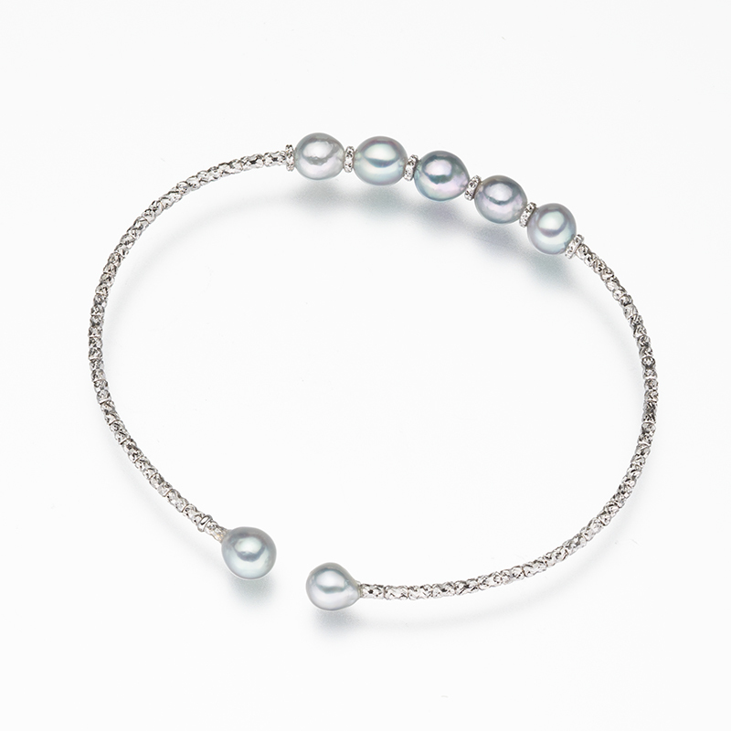 K18ホワイトゴールドに、5.0?5.5mmのアコヤナチュラルパールをあしらったバングルタイプのブレスレット。