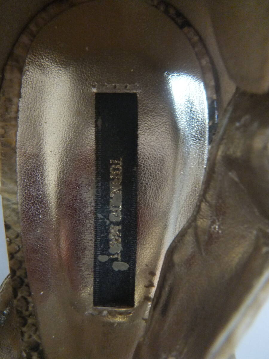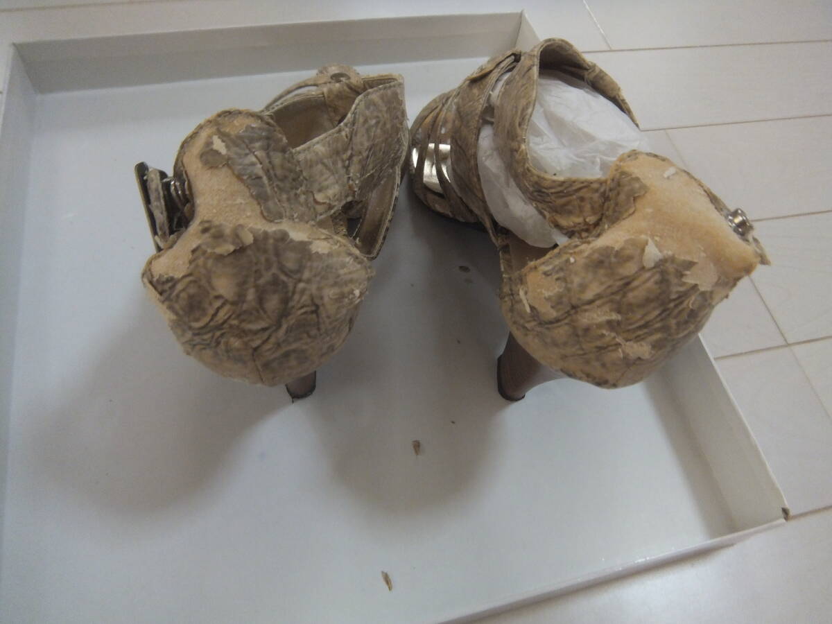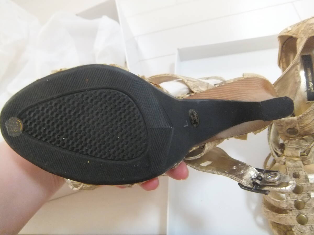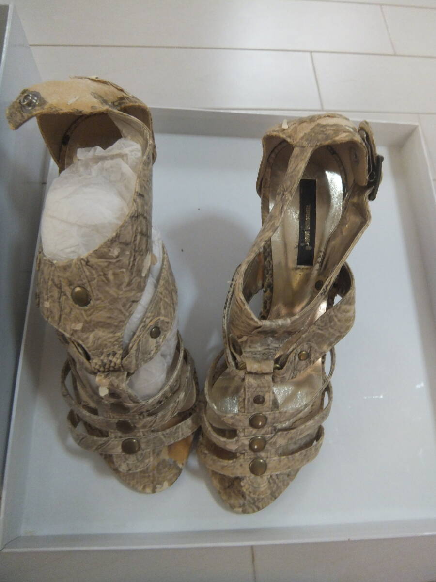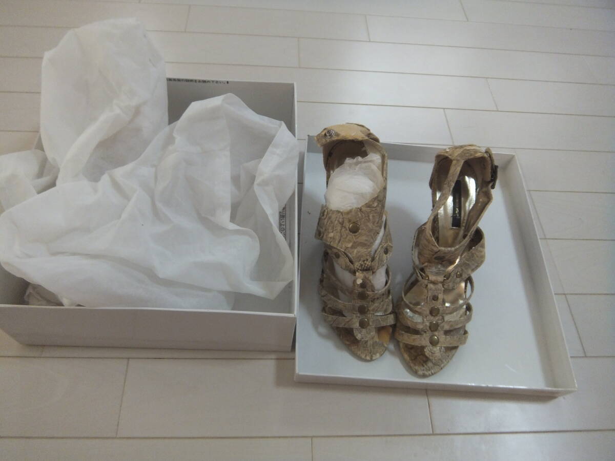クロコダイル柄のサンダルです。 デザインが気に入って買いましたが、一度はいてヒールの高さに疲れてしまい、それっきり履くのをやめていました。靴底を見ていただければわかると思いますが、そのため汚れは少ないです。 ただ画像にもありますように親指の部分の負担が大きかったのか、生地がはがれてしまったり、長期自宅保管でアキレスけん側の皮の部分が剥がれてしまっているので、それを理解していただける方のみ入札をお願いします。 サイズはLサイズです。購入時の箱も取ってあるので、そちらにいれて配送します。横浜市泉区の自宅付近に来ていただける方は送料無料になります。
