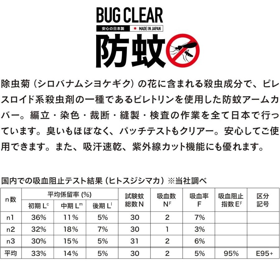 蚊を寄せ付けない。洗濯60回後の効果テスト済み。