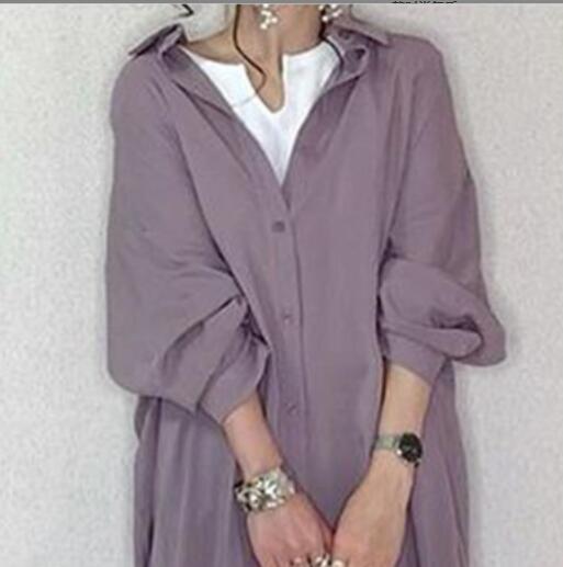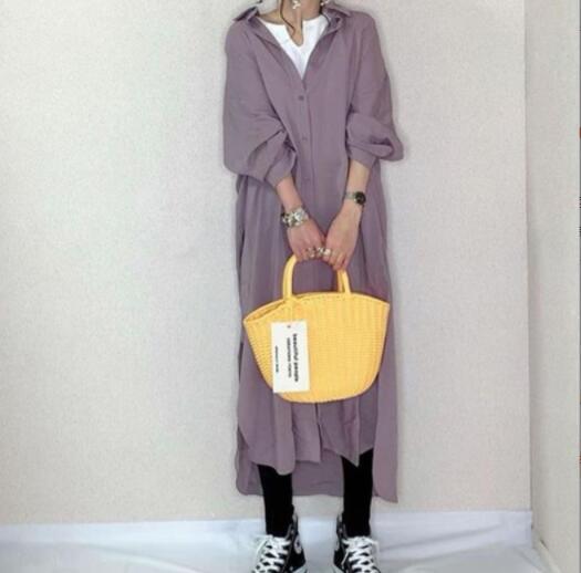 高品質コットン風素材のロング丈ワンピはおったりもOKシャツワンピ新品大きいサイズくすみ紫がおしゃれなロング丈