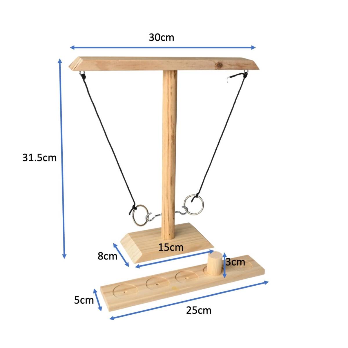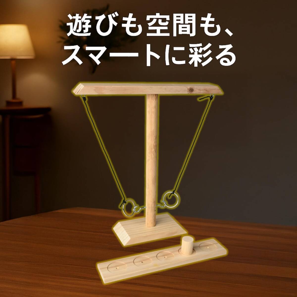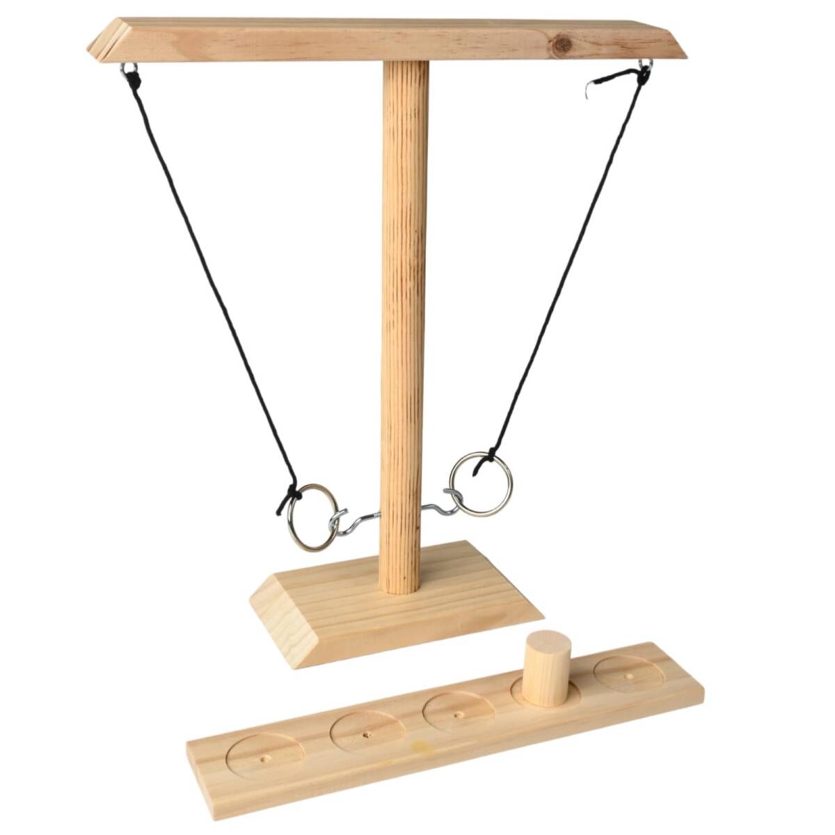 • ロープの先のリングを振り子のようにスイングさせ、中央の支柱にあるフックに引っ掛けるだけのシンプルなルールで、家族や友人とのパーティーを一層盛り上げます。独自のルールを作って楽しむこともできます。