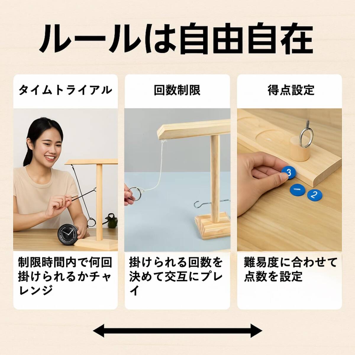 • シンプルなルールで、子供から大人まで一緒に遊ぶことができるリングトスゲームです。パーティーなどでのアイスブレークとしてもご活用いただくことができます。