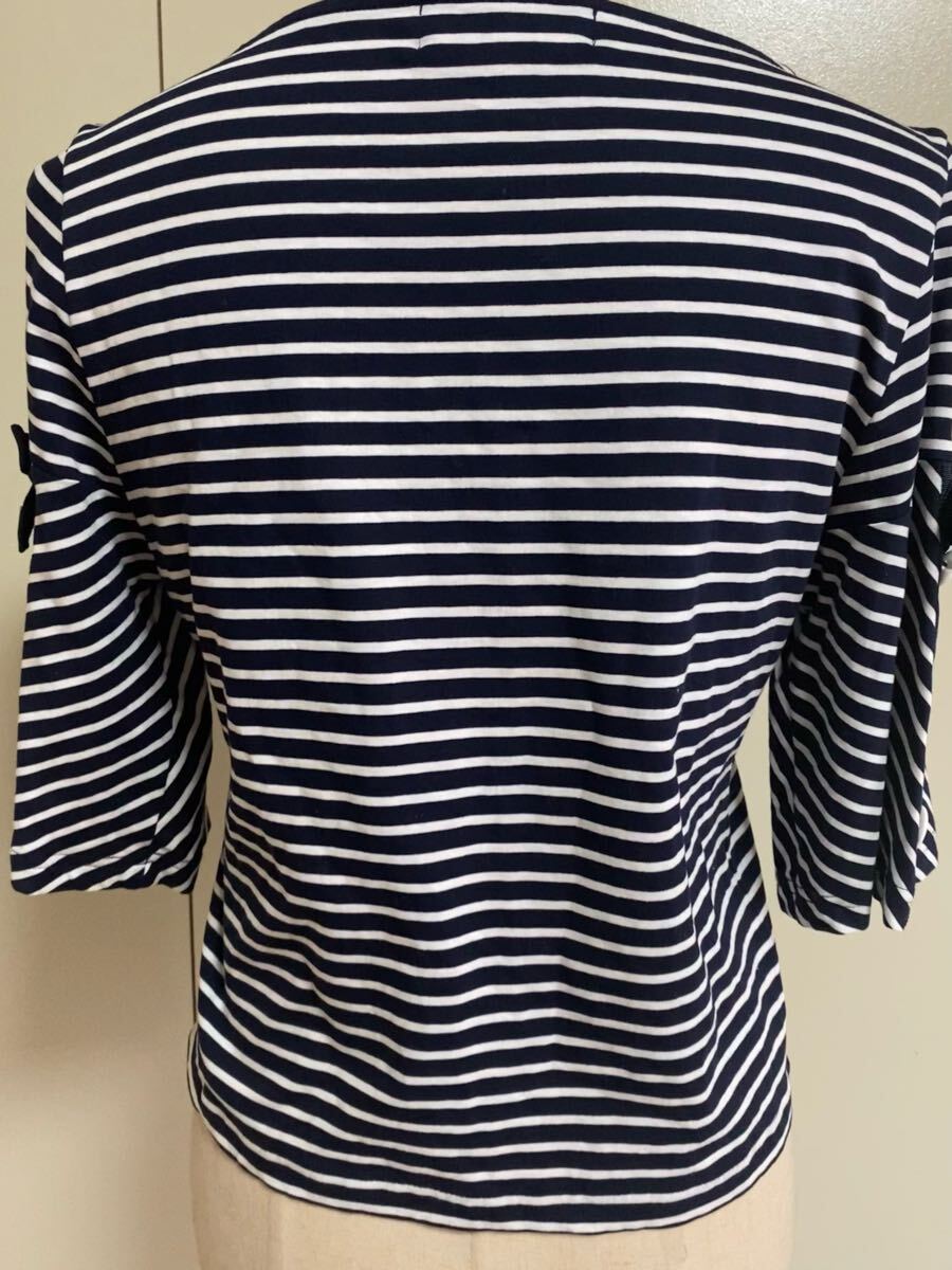 ボーダーデザインの五分袖トップス、リボンとボタンが特徴的。