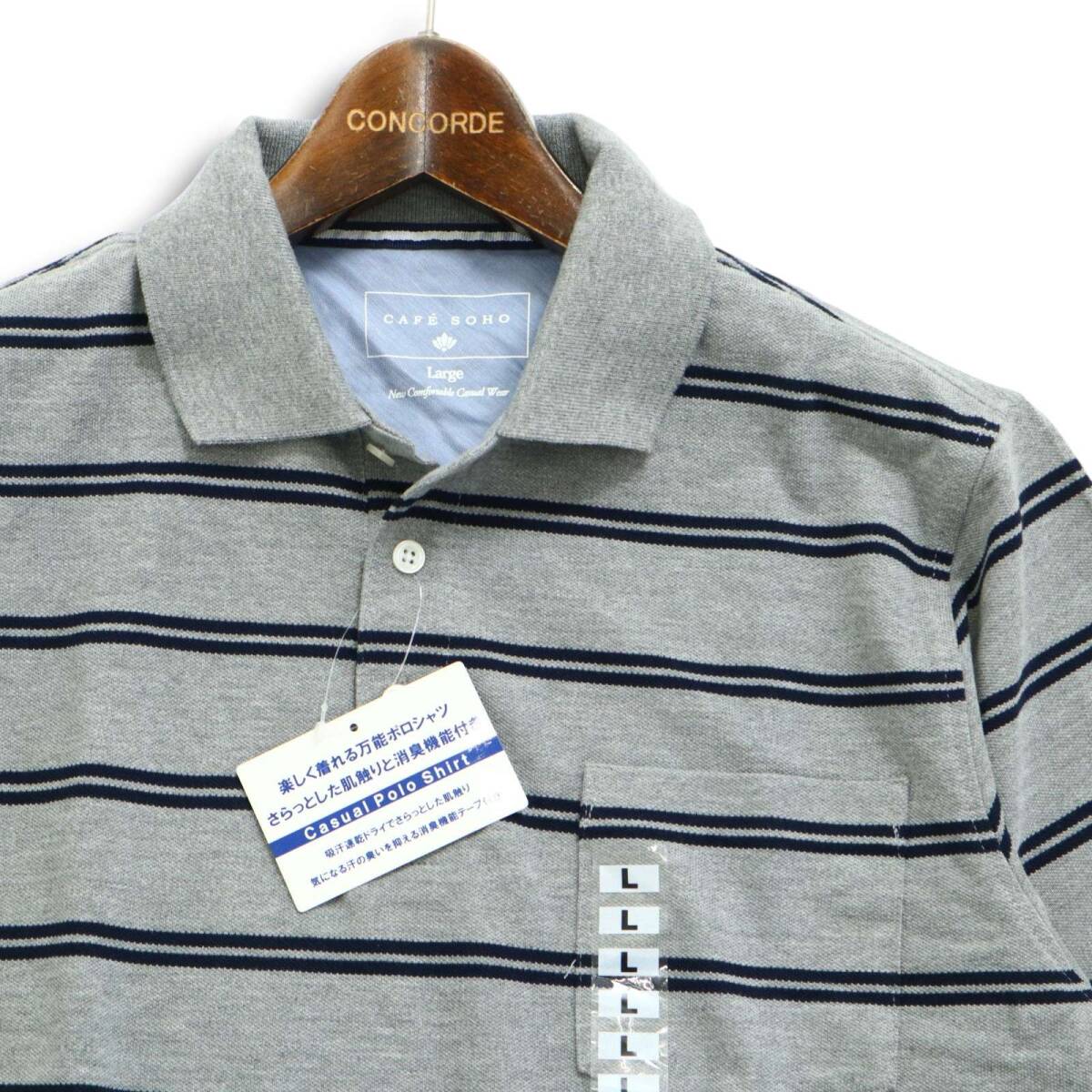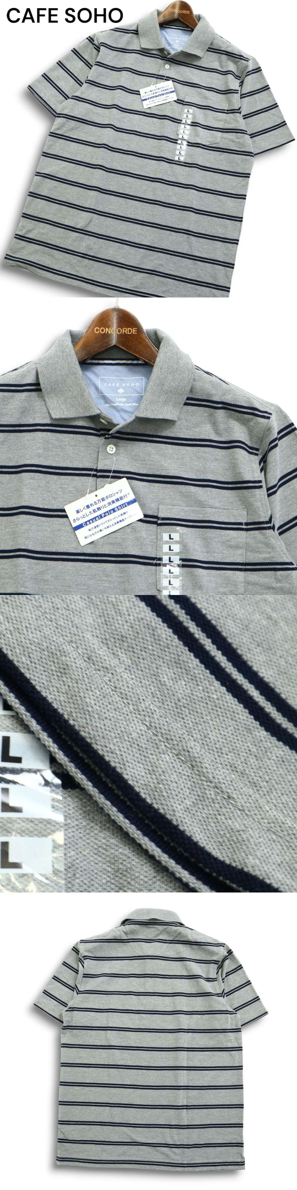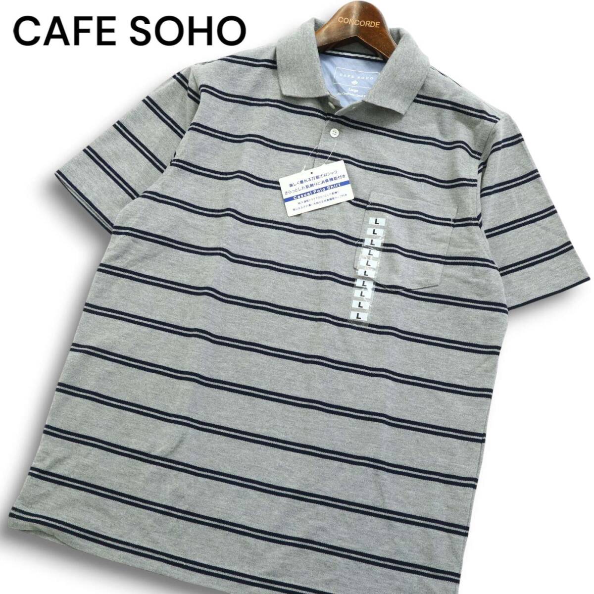 【新品 未使用】 CAFE SOHO カフェソーホー 春夏 吸汗速乾★ 半袖 鹿の子 ボーダー ポロシャツ Sz.L メンズ 灰 グレー