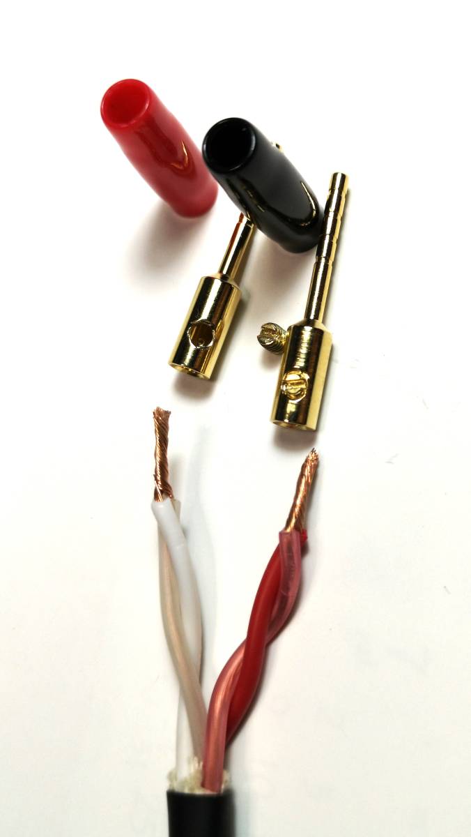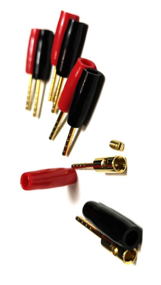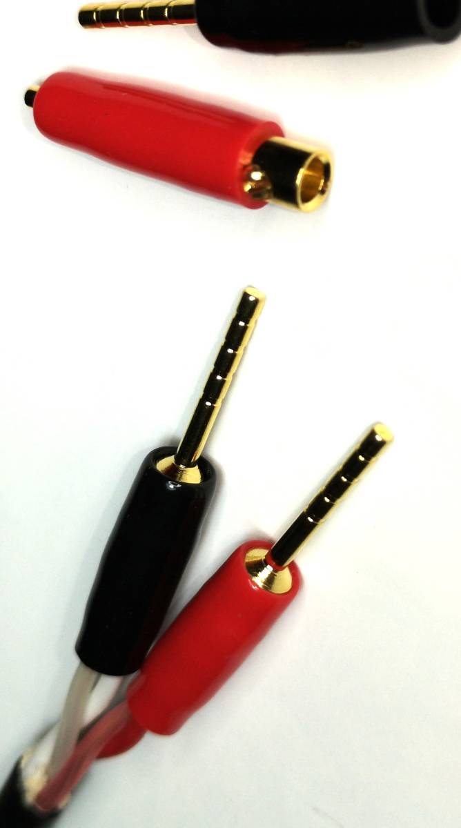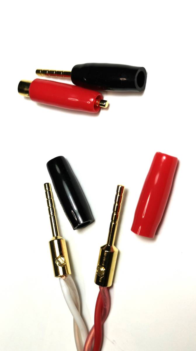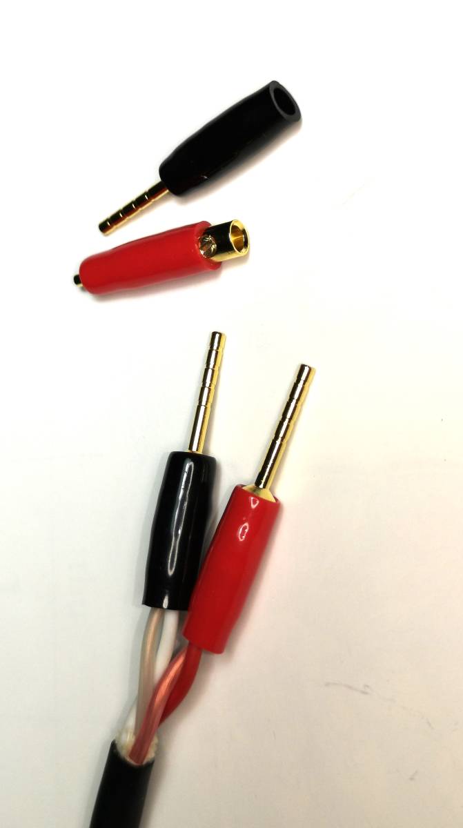 ①一般的なスピーカー端子でもバナナプラグ非対応でも簡単に取付可能な外径2mmのピン形バナナプラグで、ほとんどの端子に取付け可能です。