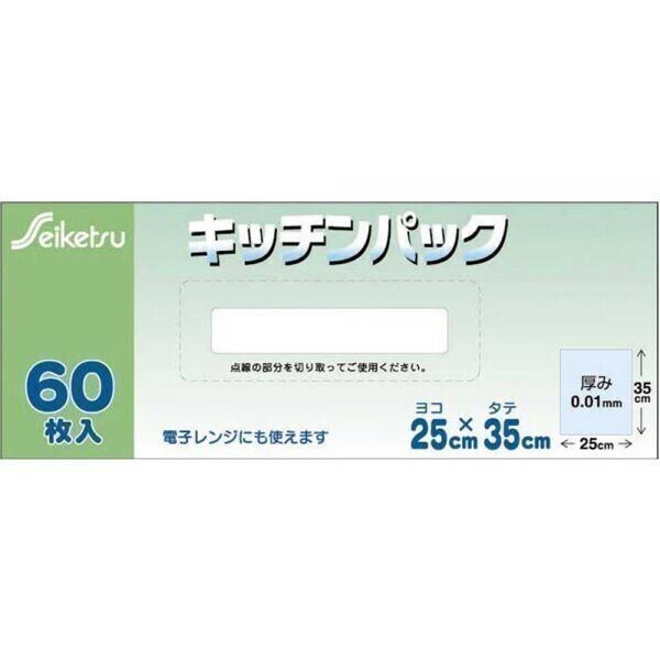 | ●台所用保存袋 電子レンジにもご使用頂けます ●色:透明※材質上『薄い半透明』になります ●厚み0.01mm ヨコ幅25cm タテ幅35cm ●材質:HDPE(高密度ポリエチレン) ●袋の素材は引っ張り強度が強く、耐熱・耐薬品性・耐ガスバリア性に優れます ●透明度が低くレジ袋のようにカサカサした感触が特徴です 【商品詳細】 サイズ:厚み0.01mmXヨコ幅25cmXタテ幅35cm 材質:HDPE(高密度ポリエチレン) 色:透明 内容量:1箱60枚入り 生産国:中国 JANコード:4976797108952 製造メーカー:株式会社セイケツネットワーク |
