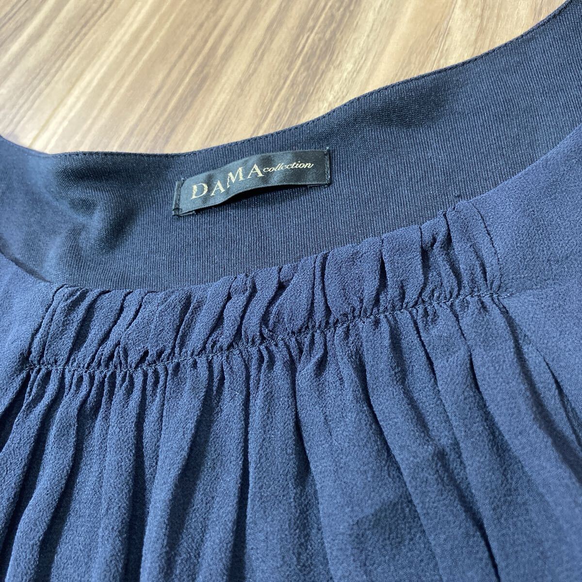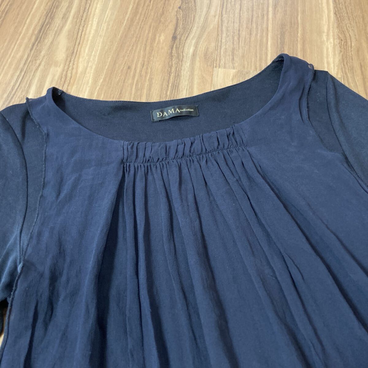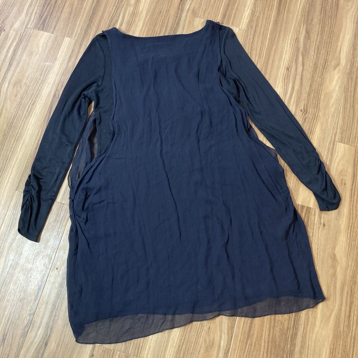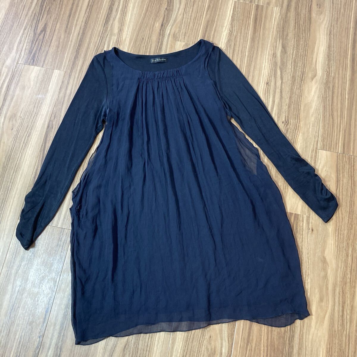 YT3627 DAMA ダーマ レイヤード風シフォンチュニック サイズL ネイビー シルク100% 長袖 シルクシフォン Aラインミニワンピース ディノス
