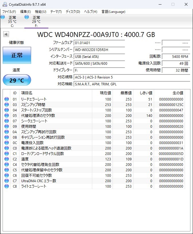 CrystalDiskInfoの画像は2枚目をご確認下さい。