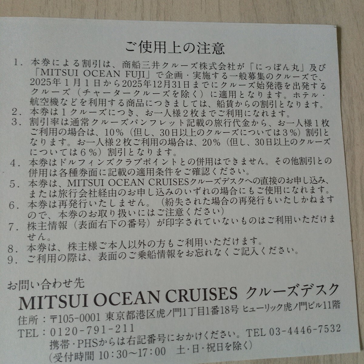 1枚利用で10%割引(30日以上のクルーズは3%)