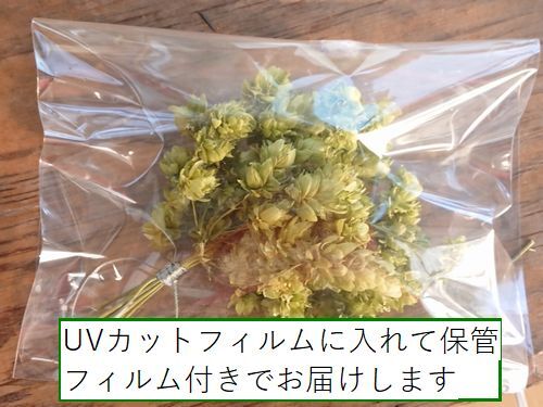 加えて、ドライフラワーを長持ちさせるために、UVカットフィルムに入れて保管、フィルム付きでお届けします。