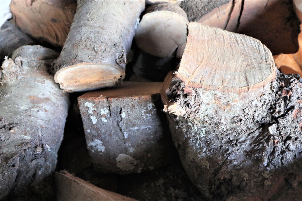 | ※原木置き場は、外置きの為、端々の切り口が黒ずんでいる場合も有りますし、玉切後は軒下で |
