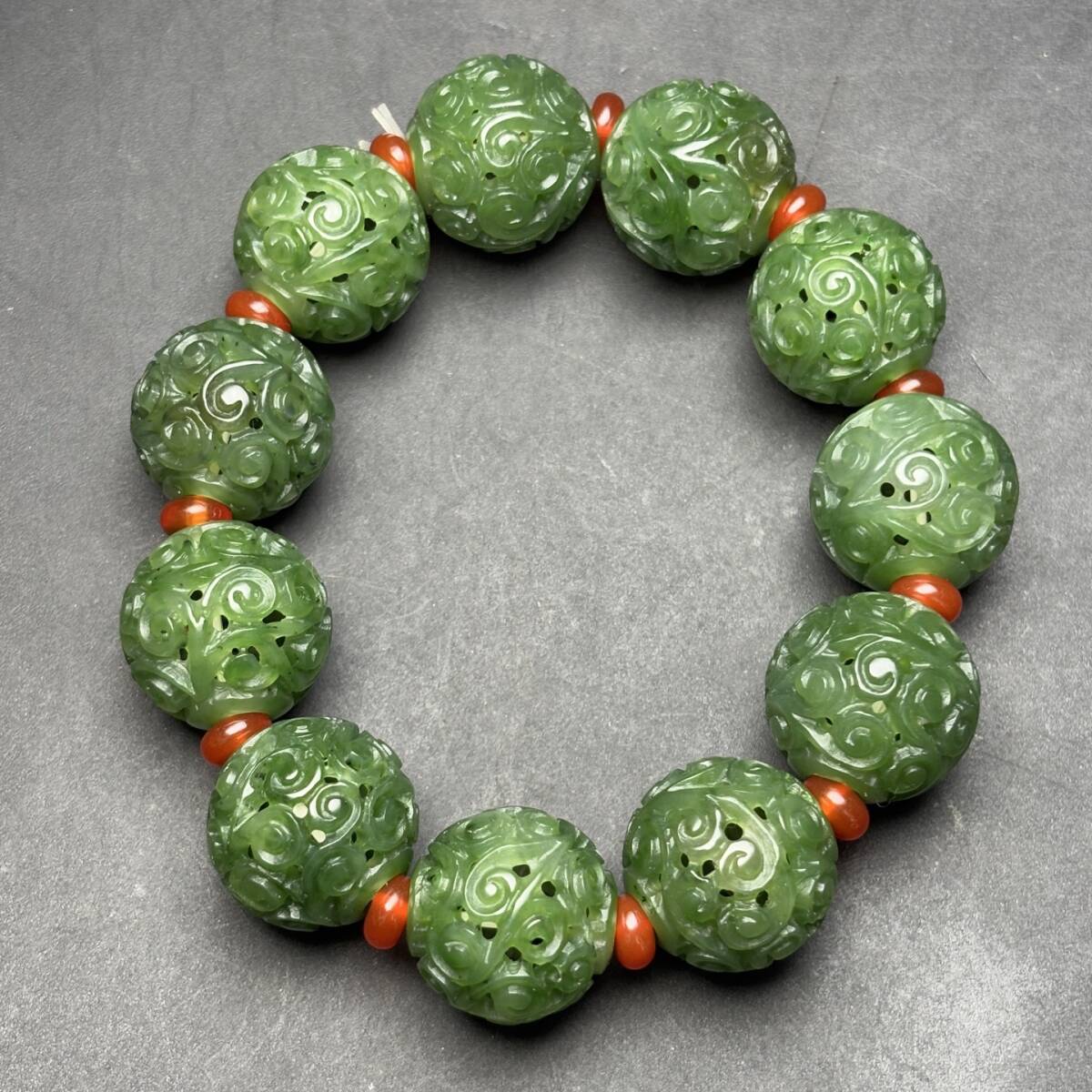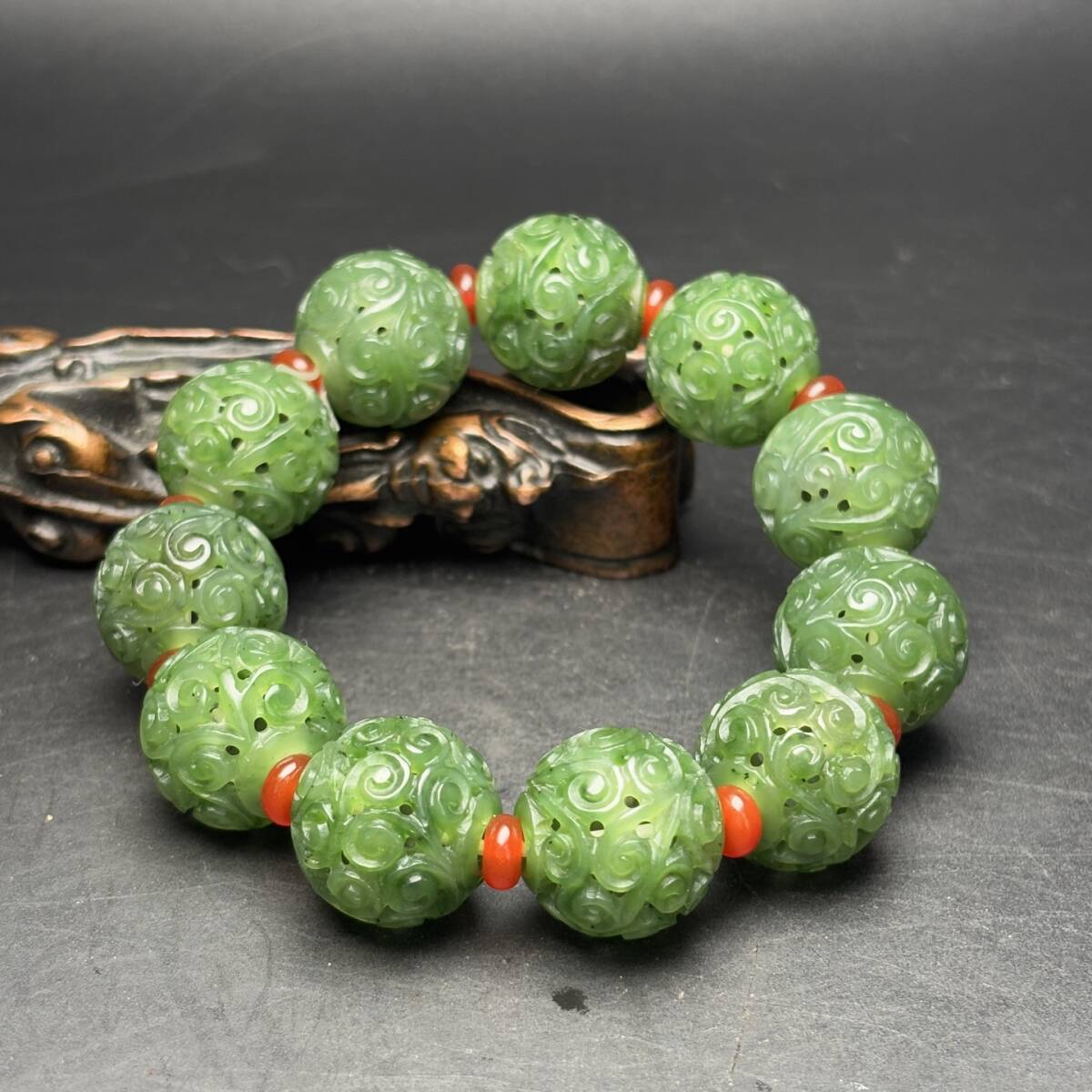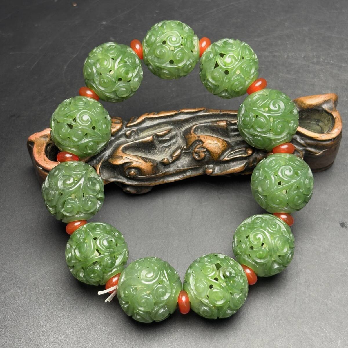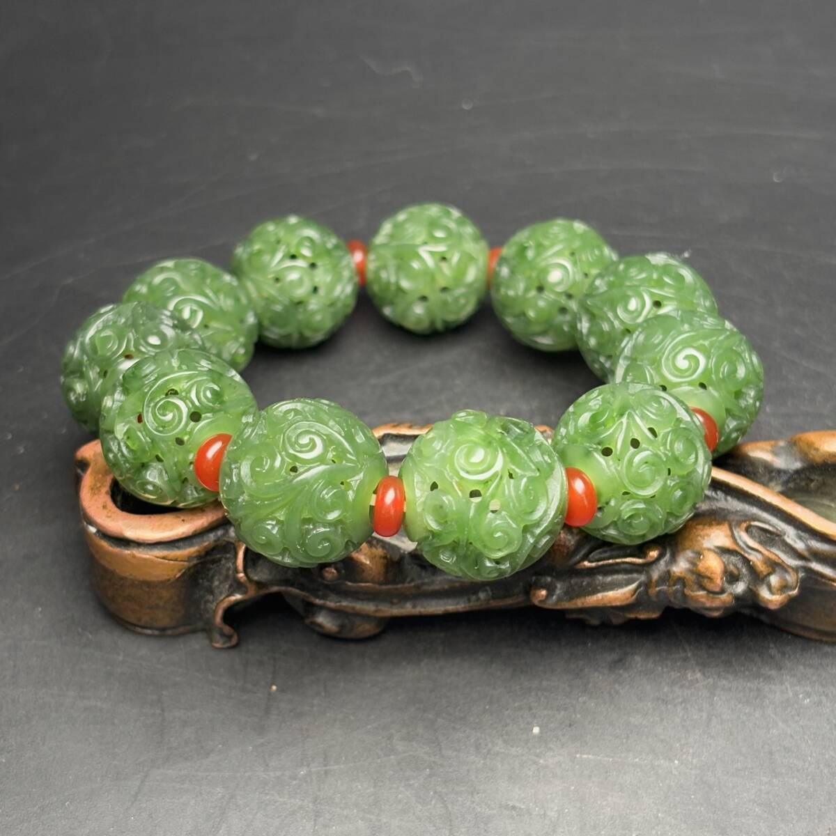 *珍品旧蔵* 清 玉彫 和田碧玉 鏤空手鏈 彫刻如意紋 玉質細膩 綠色陽 畢生如意 事事順心 彫刻精美 玉質温潤 極細工 中国古玩 骨董品 H48