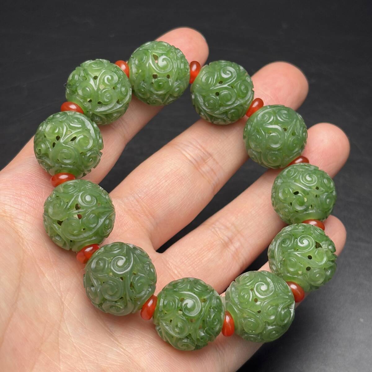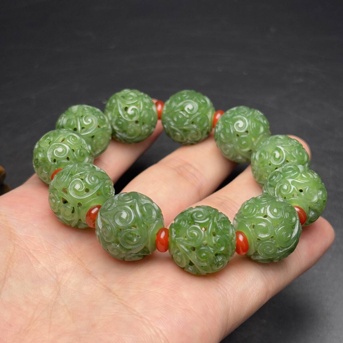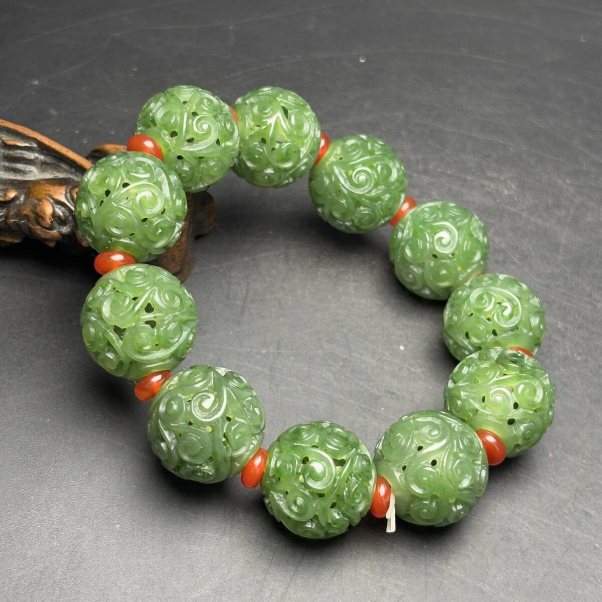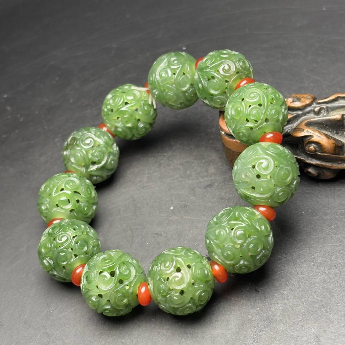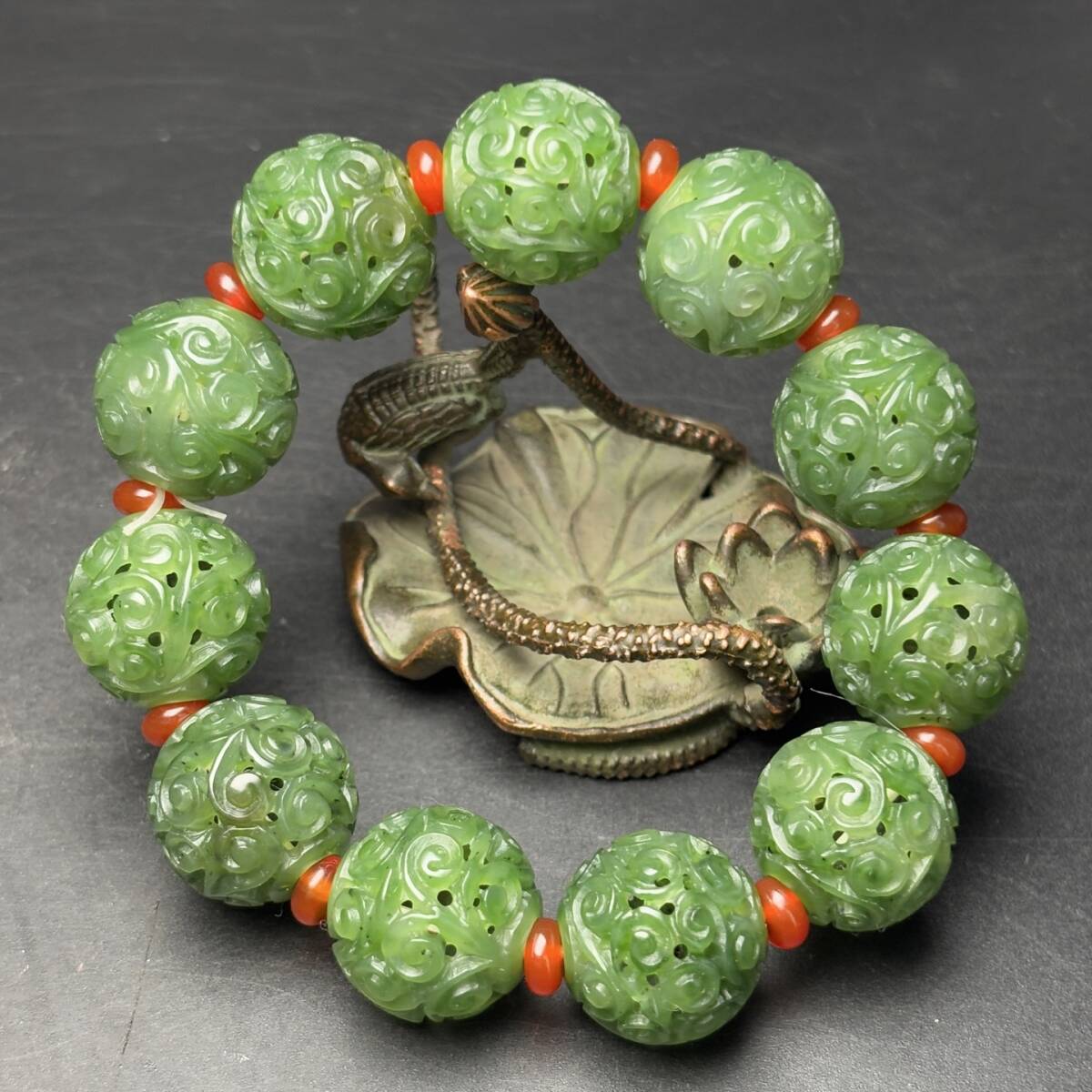 *珍品旧蔵* 清 玉彫 和田碧玉 鏤空手鏈 彫刻如意紋 玉質細膩 綠色陽 畢生如意 事事順心 彫刻精美 玉質温潤 極細工 中国古玩 骨董品 H48