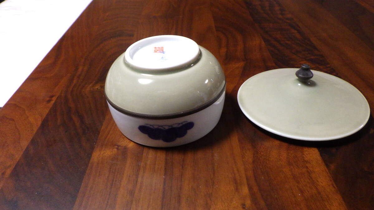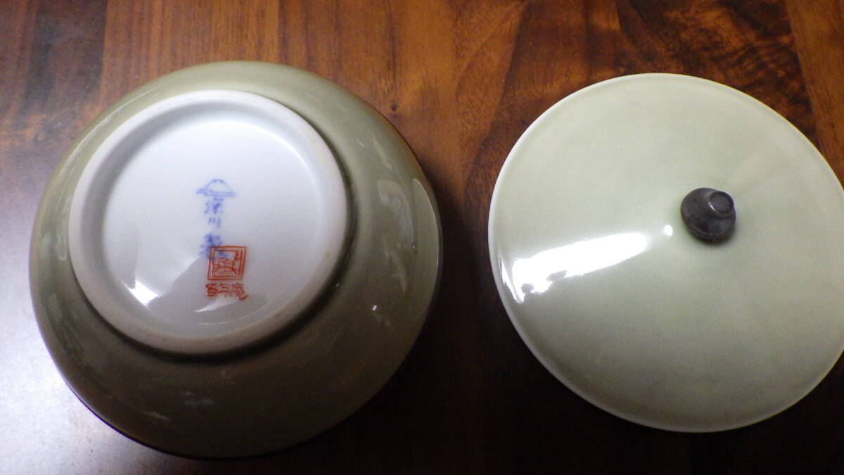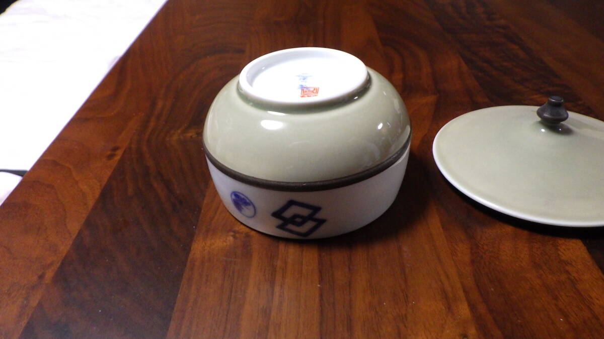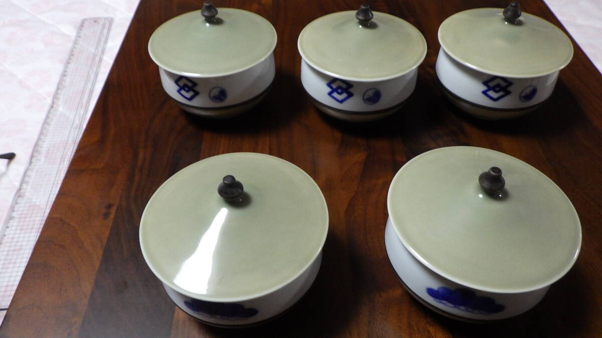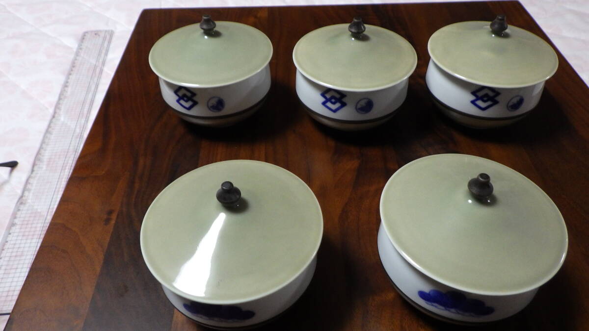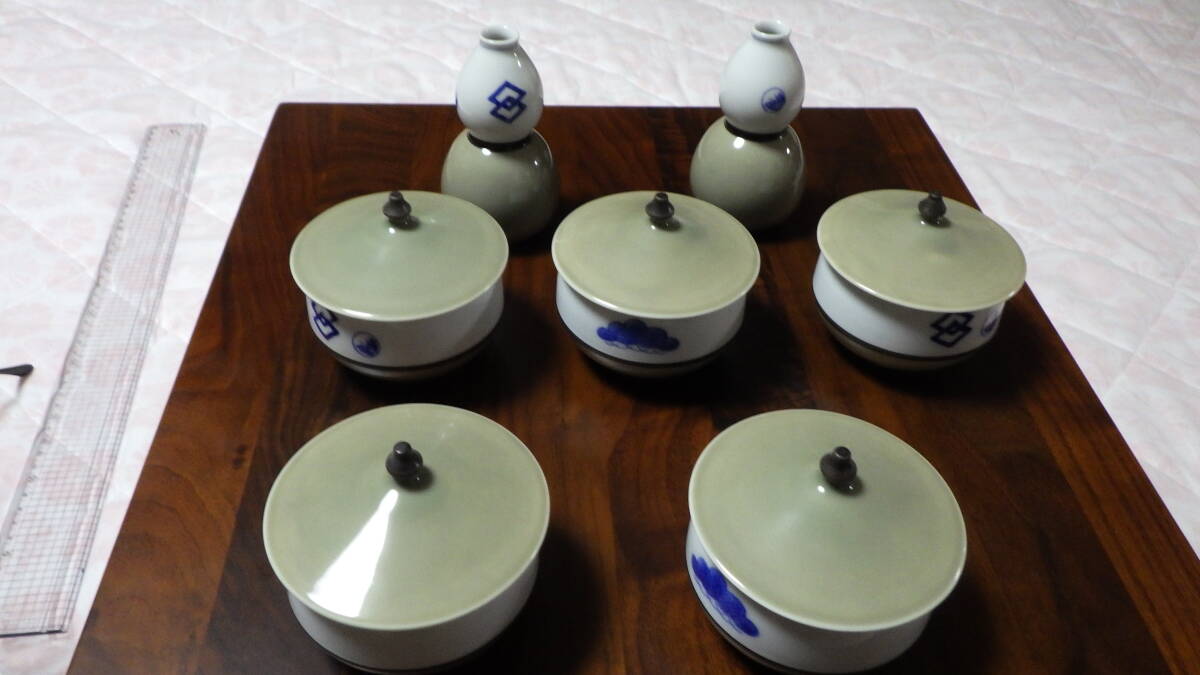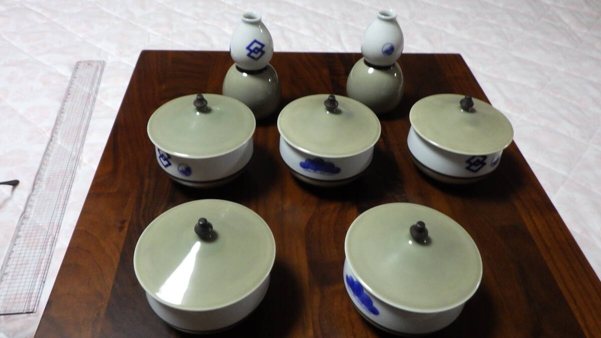 深川製磁 百年庵シリーズ 丸紋染付鉄釉胴紐茶灰釉蓋つき湯飲み五客 お預け徳利二本です。購入後飾り棚で飾っておいたのでもちろん未使用のお品です。