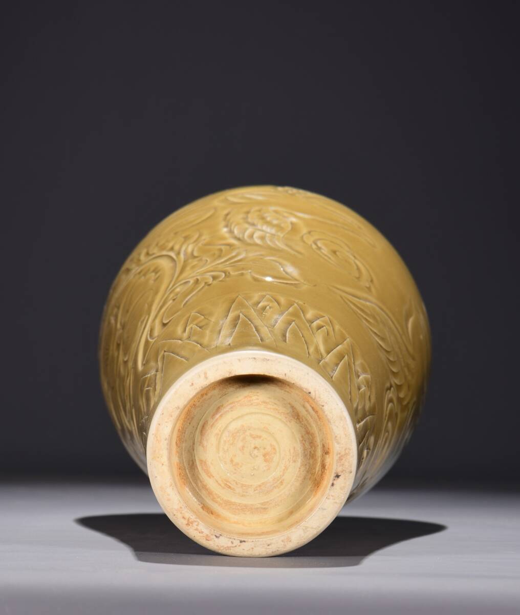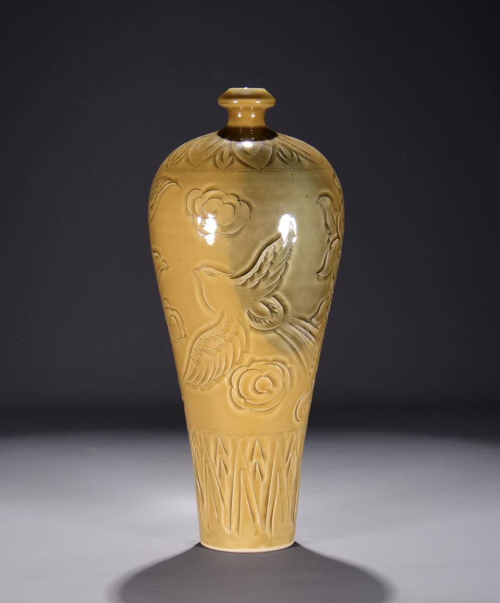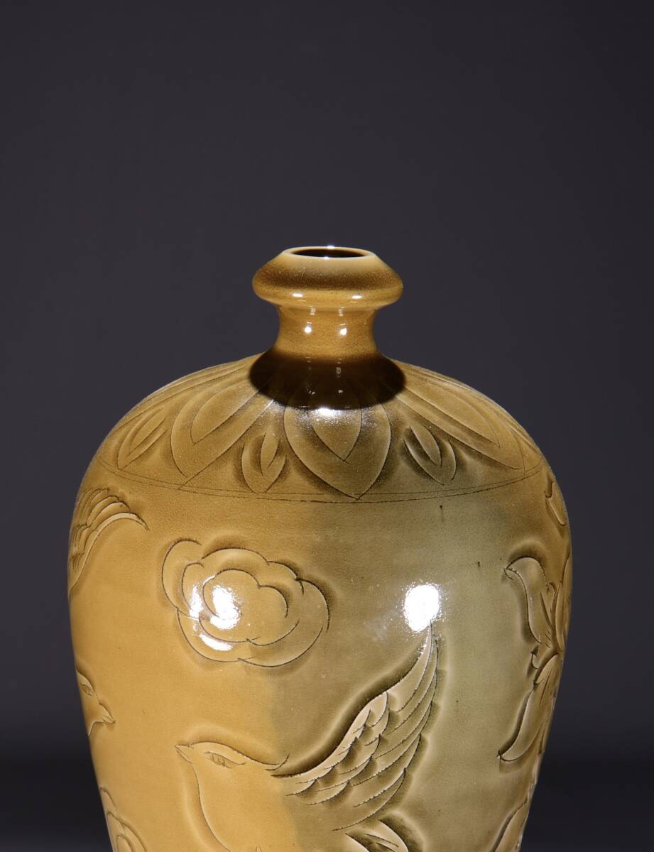 宋時代 古陶磁器 耀州 青瓷 花鳥紋 梅瓶 賞瓶 花瓶 題刻磁器 文案置物 擺件 時代物 古董品 骨董 旧家蔵出し 唐物 中国古玩 古美術品
