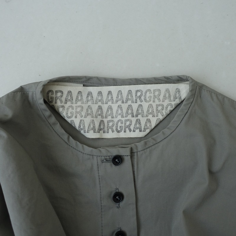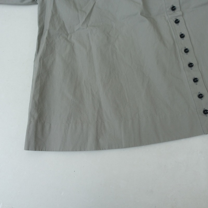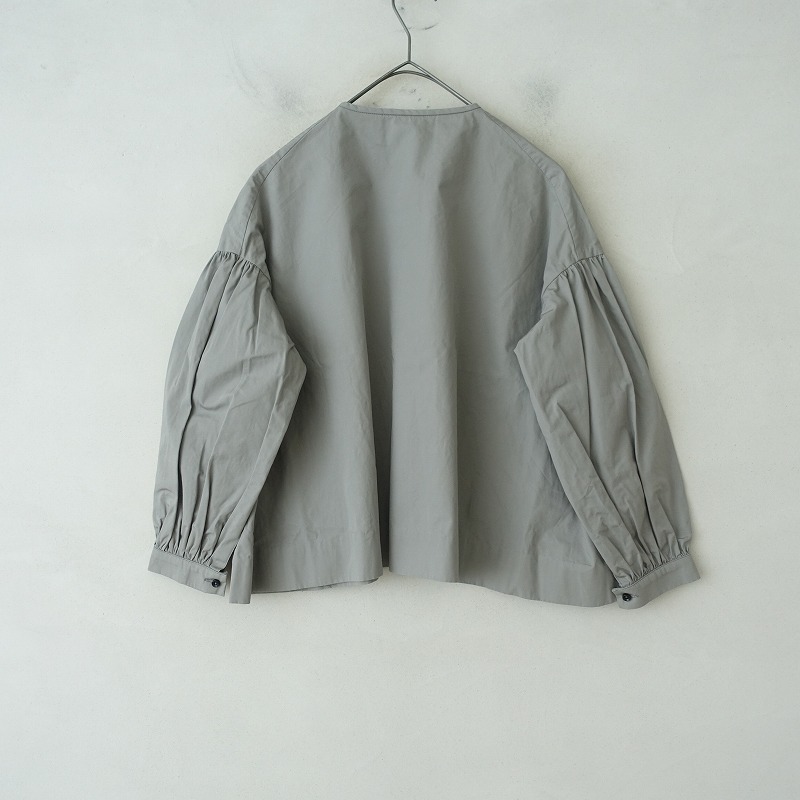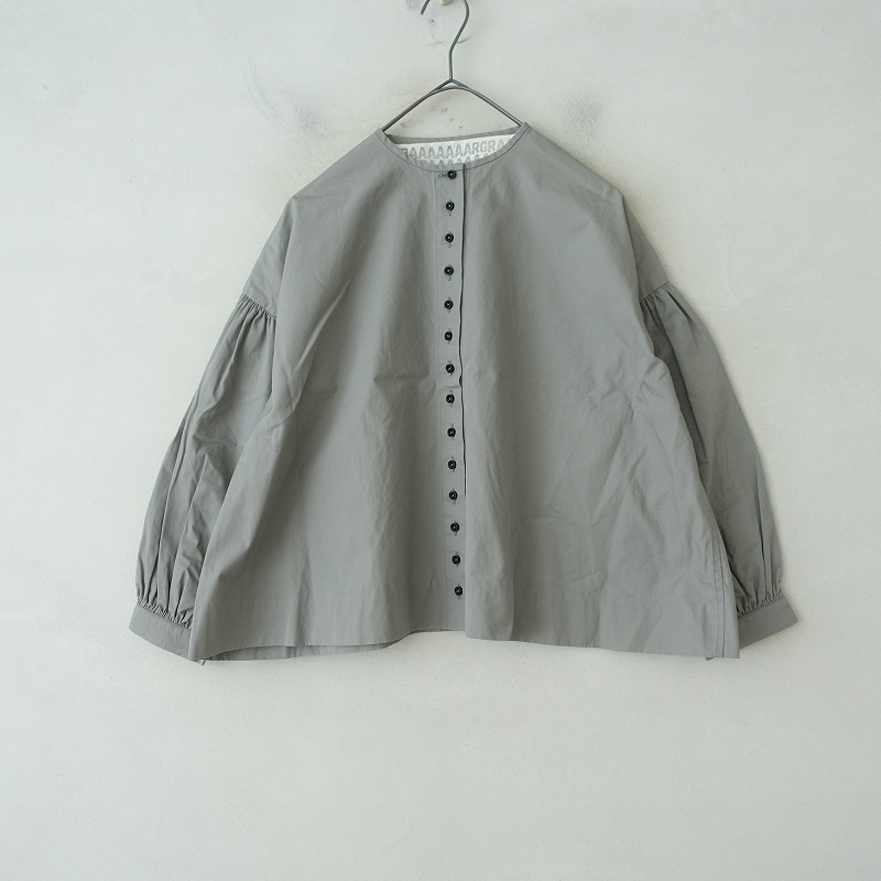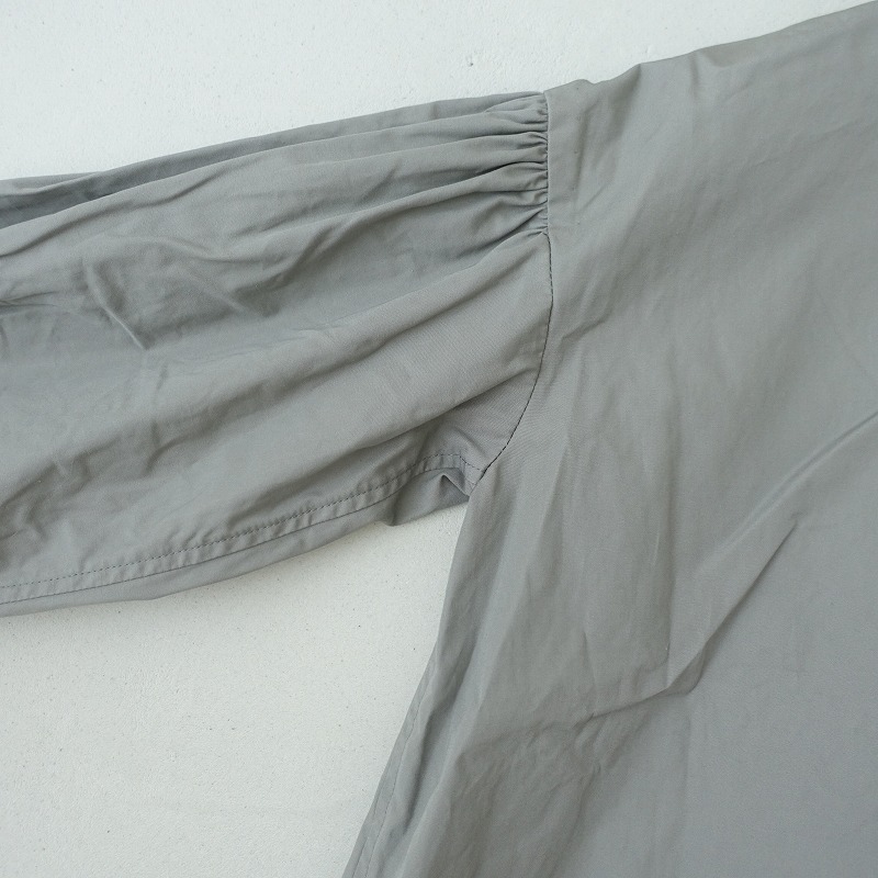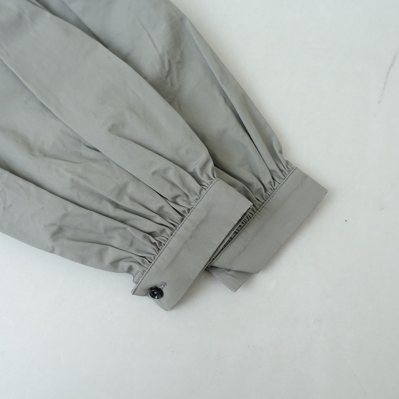 | ebagosの高密度サテン長袖ブラウスです。カラーはグレーで、ハリのある布帛地です。フロント&袖口ボタンで着脱でき、袖にはギャザーが施されております。 |