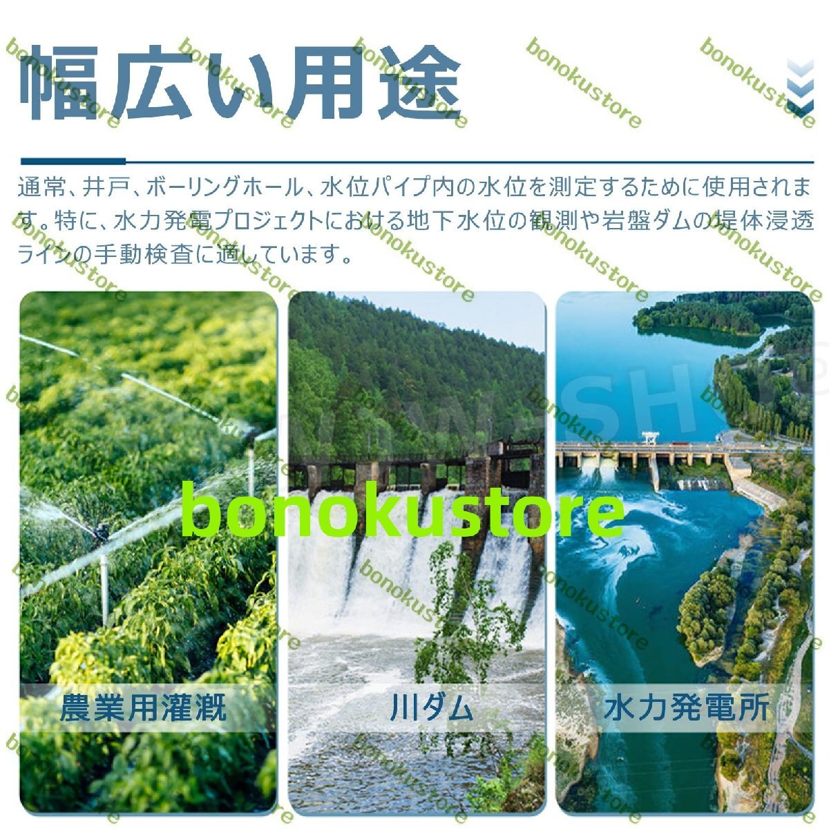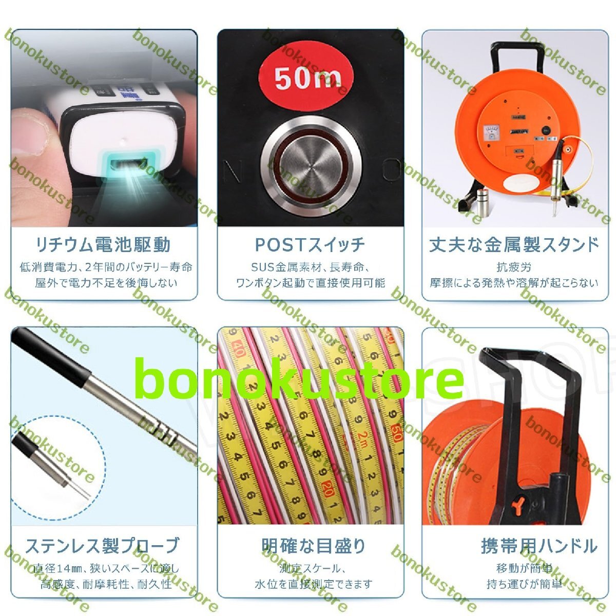 ポータブル深井戸水位計インジケータ水位ボーリングホール深度計ディップメーター深度10m 20m 30m 50m 100m 150m 200m 300m 500m地下水位検出器は、地下水位の測定など、水利プロジェクト、水文学および地理学、産業および農業などの水位測定に広く使用できます農村灌漑地域、貯水池ダム、河川堤防、発電所などの井戸水位の測定に使用できます。仕様材質:ステンレス製プローブ + スチール製定規ケーブル測定深度(m):0~500m最小表示値(m):1再現性誤差(mm):±2.0動作電圧(V):DC=9機器の適用温度範囲:-20℃~+60℃寸法(高さ×幅):450mm×310mmプローブサイズ:水位計 150mm×25mmパッケージ内容水位計 1個ご注意1. 撮影時の光やモニターの違いなどにより、色が若干異なる場合がございます。実際の商品をご確認ください。2. 製品サイズは手作業で測定しているため、多少の誤差が生じる場合がございますのでご了承ください。
