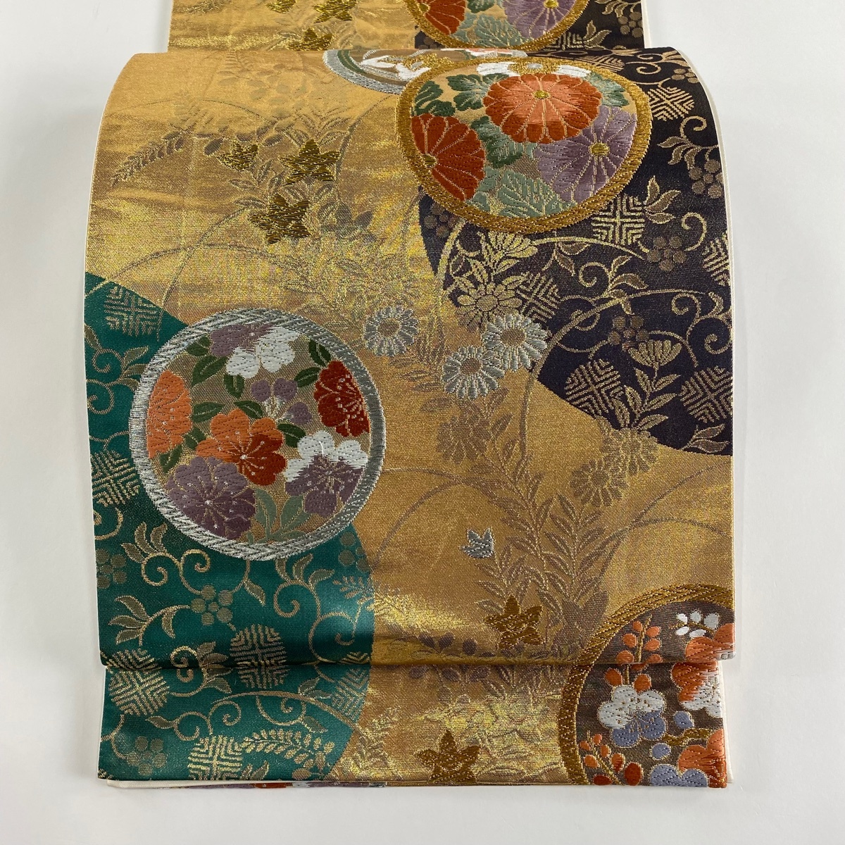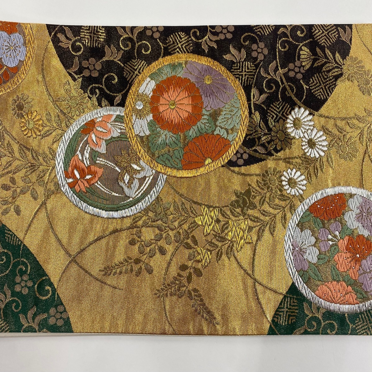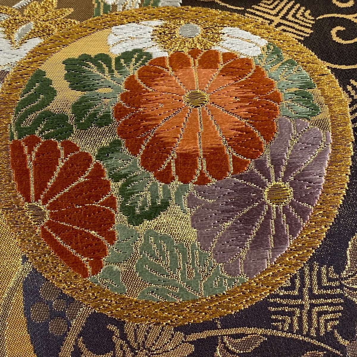 | 袋帯 美品 秀品 花丸文 笹蔓 金銀糸 箔 金色 六通 正絹 【中古】 |