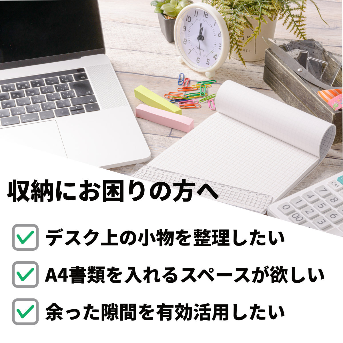 A4サイズ対応で書類なども収納可能(耐荷重1kg)