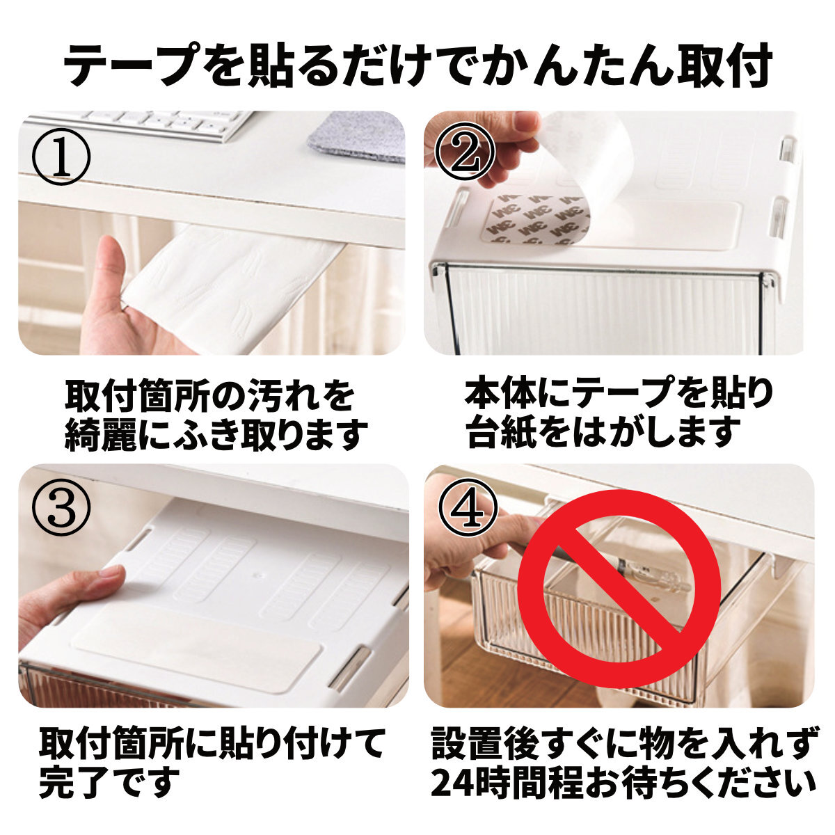 【設置が容易】工具は不要で簡単設置。設置場所をきれいにして両面テープを貼るだけで簡単に設置出来ます。両面テープの粘着力を確保するため、設置完了後は収納せずに24時間放置してからご使用ください。