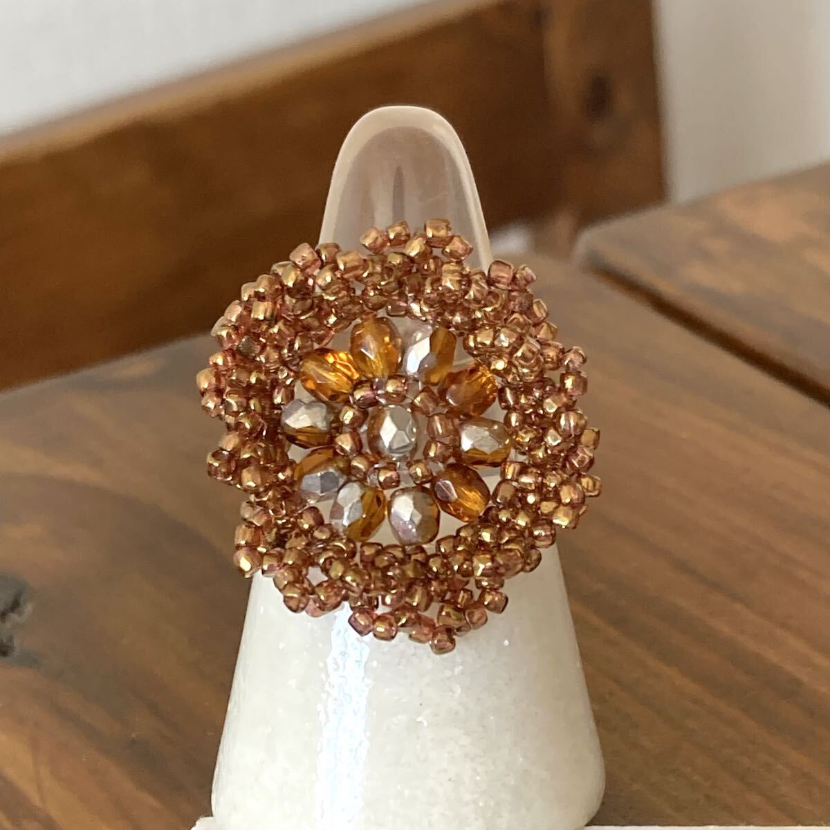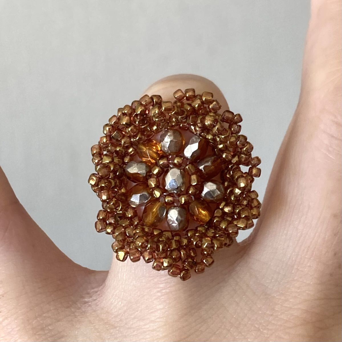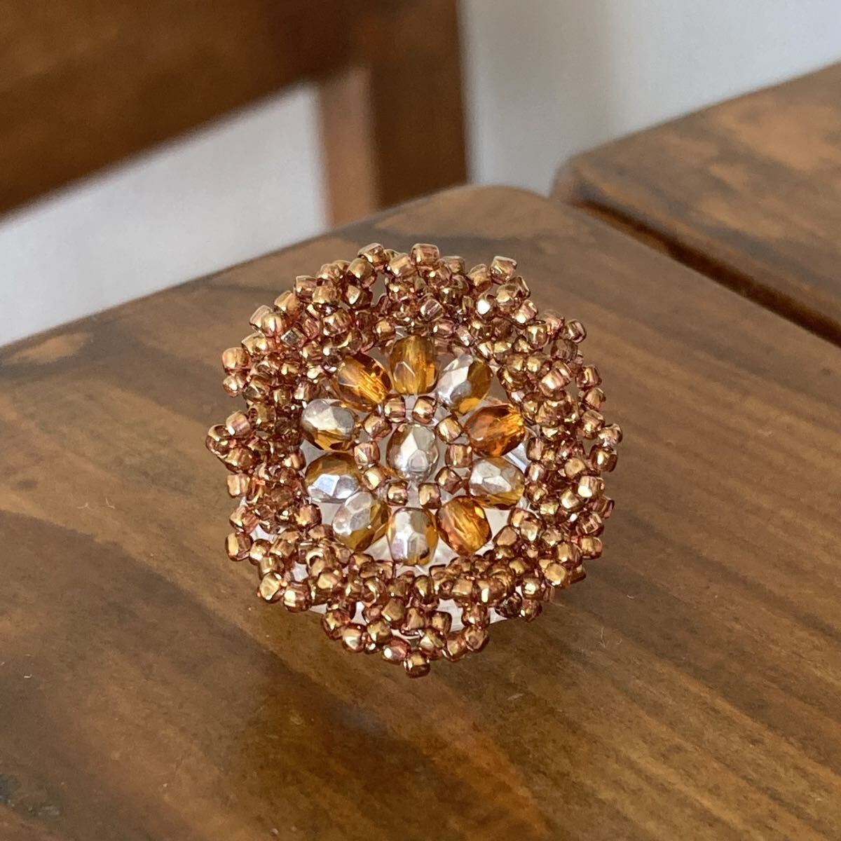 ビーズ リング 指輪 ハンドメイド 大きい丸型のレース風リング ブラウン×シルバー 16-18号です。